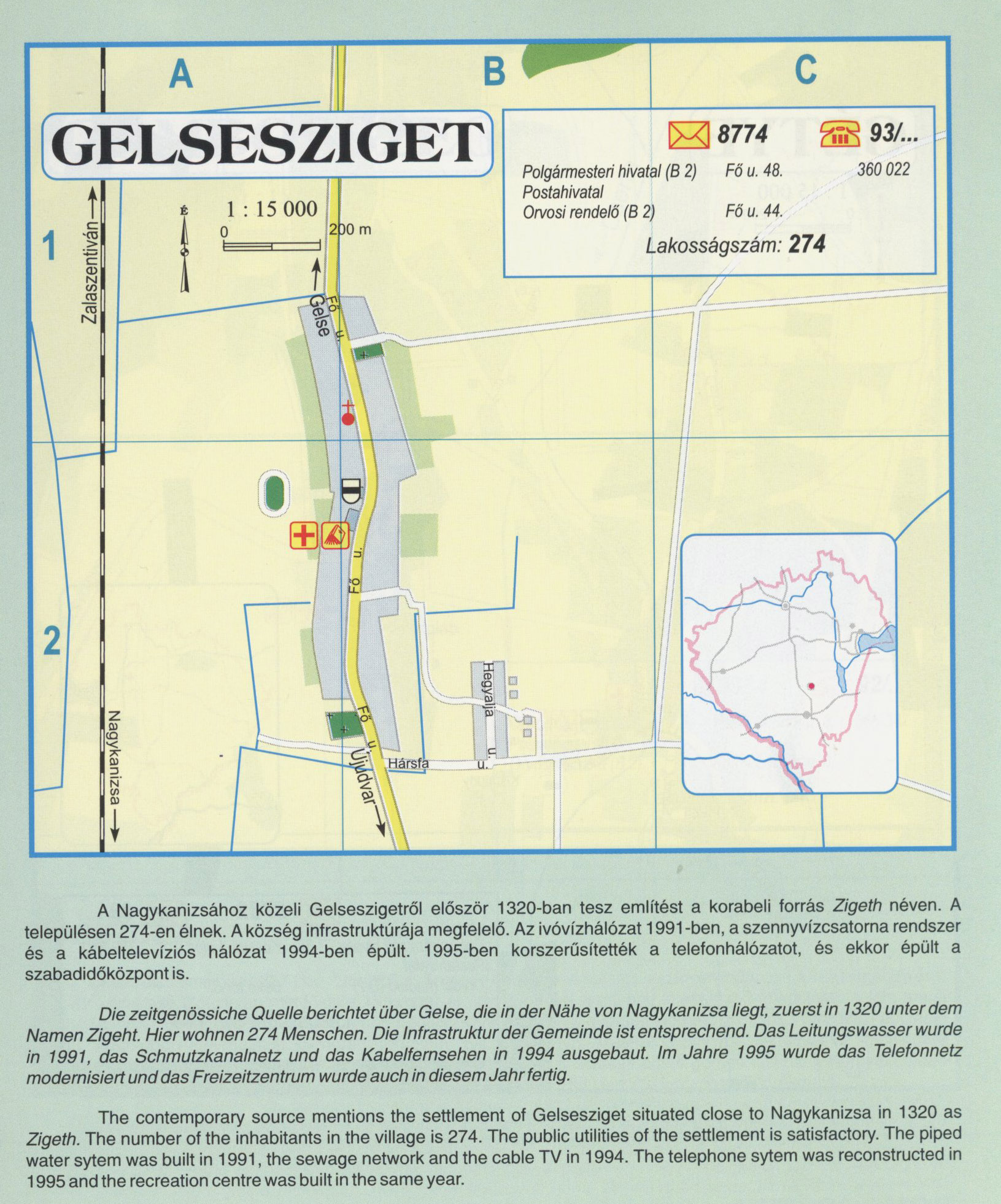 Nyilvános 2050 | 7216 | GELSESZIGET | A Nagykanizsához közeli Gelseszigetről először 1320-ban tesz említést a korabeli forrás Zigeth néven. A településen 274-en élnek. A község infrastruktúrája megfelelő. Az ivóvízhálózat 1991 -ben, a szennyvízcsatorna rendszer és a kábeltelevíziós hálózat 1994-ben épült. 1995-ben korszerűsítették a telefonhálózatot, és ekkor épült a szabadidőközpont is. Die zeitgenössiche Quelle berichtet über Gelse, die in der Nahe von Nagykanizsa liegt, zuerst in 1320 unter dem Namen Zigeht. Hier wohnen 274 Menschen. Die Infrastruktur der Gemeinde isi entsprechend. Das Leitungswasser wurde in 1991, das Schmutzkanalnetz und das Kabelfernsehen in 1994 ausgebaut. lm Jahre 1995 wurde das Telefonnetz modernisiert und das Freizeitzentrum wurde auch in diesem Jahr fertig. The contemporary source mentions the settlement of Gelsesziget situated close to Nagykanizsa in 1320 as Zigeth. The number of the inhabitants in the village is 274. The public Utilities of the settlement is satisfactory. The piped water sytem was built in 1991, the sewage network and the cable TV in 1994. The telephoné sytem was reconstructed in 1995 and the recreation centre was built in the same year. A részlet a következő kiadványból származik/Die Teile stammen vom volgenden Buch/This text came from the following book: Cím/Titel/Title: Zala megye településeinek atlasza - 257 település részletes térképe/Atlas der Komitat Zala - 257 Detailte Siedlungskarten/Zala county\'s Atlas - 257 settlement maps. Közreműködő/contributor: Lackner László (1943) (fotó) Kiadás/Ausgabe/Publisher: Gyula : HISZI-MAP, 1997 Sorozat/Serie/Series: Indulástól - megérkezésig... ETO: 912(439.121-2) ; 908.439.121 Cutter: Z 19 ISBN: 963-610-025-4 Oldalszám/Seiten/Pages: 323, 81 p. Megjegyzés/Note: Lezárva/Abgeschlossen am/Closed am: 1997. máj. 30. |