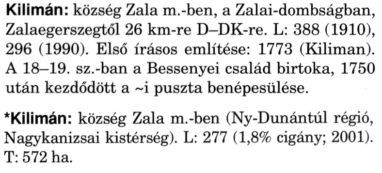 Nyilvános 2207 | 6009 | A szócikkek felismertetett szövege: | (A csillag után a kiegészítő kötetből származó szöveg következik) Kilimán: község Zala m.-ben, a Zalai-dombságban, Zalaegerszegtől 26 km-re D-DK-re. L: 388 (1910), 296 (1990). Első írásos említése: 1773 (Kiliman). A 18–19. sz.-ban a Bessenyei család birtoka, 1750 után kezdődött a ~i puszta benépesülése. *Kilimán: község Zala m.-ben (Ny-Dunántúl régió, Nagykanizsai kistérség). L: 277 (1,8% cigány; 2001). T: 572 ha. A szócikkek a következő lexikonból származnak: Cím: Magyar nagylexikon Közreműködő: Élesztős László (1949) (szerk.) ; Barabás Éva (1943) (szerk.) ; Berényi Gábor (1946) (szerk.) ; Bárány Lászlóné (szerk.) ; Adelmann-né Kertész Judit (1945) (közrem.) ; Froemel Károlyné Jáky Éva (1936) (közrem.) ; Akadémiai Kiadó és Nyomda Vállala Szerz. közl.: [... Élesztős László főszerk.] ; [szerk. Barabás Éva et al.] ; [bibliogr. Adelmanné Kertész Judit] ; [kész. az Akadémiai Kiadó Magyar Nagylexikon Szerkesztőségében] Kiadás: Budapest : Akad. K., 1993- Kötetei: 1. köt., A - Anc 2. köt., And - Bag 3. köt., Bah - Bij 4. köt., Bik - Bz 5. köt., C - Csem 6. köt., Csen - Ec 7. köt., Ed - Fe 8. köt., Ff - Gyep 9. köt., Gyer - Iq 10. köt., Ir - Kip 11. köt., Kir - Lem 12. köt., Len - Mep 13. köt., Mer - Nyk 14. köt., Nyl - Pom 15. köt., Pon - Sek 16. köt., Sel - Szö 17. köt., Szp - Ung 18. köt., Unh - Z 19. köt., Kiegészítő kötet, A - Z ETO jelzet: 030=945.11 Szakjelzet: 030 Cutter: M 14 ISBN: 963-05-6611-7 [!ISBN 963-05-6615-X] Nyelv: magyar Megjegyzés: Az 5. kötettől kiad. a Magyar Nagylexikon Kiadó ; A 6. kötettől főszerk. Berényi Gábor ; A 6. kötettől szakszerk. Bárány Lászlóné et al. ; A 6. kötettől bibliogr. Froemel Károlyné ; Bibliogr. a szócikkek végén |
