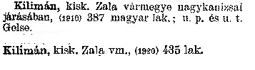 Nyilvános 2163 | 5820 | Kilimán | kisk. Zala vármegye nagykanizsai járásában, (1910) 387 magyar lak.; u. p. és u. t. Gelse. Kilimán kisk. Zala vm., (1920) 435 lak. Cím: Révai nagy lexikona Alcím: az ismeretek enciklopédiája Kiadás: Budapest : Révai testvérek, [1911]- Kötetei: 1. köt., A - Arany 2. köt., Arány - Beke 3. köt., Béke - Brutto 4. köt., Bratus - Csát 5. köt., Csata - Duc 6. köt., Duc - Etele 7. köt., Stelka - Földöv 8. köt., Földpálya - Gres 9. köt., Gréc - Herold 10. köt., Hérold - Jób 11. köt., Jób - Nontur 12. köt., Kontúr - Lovas 13. köt., Lovas - Mons 14. köt., Mens - Ottó 15. köt., Ottó - Racine 16. köt., Racine - Sodoma 17. köt., Sodoma - Tarján 18. köt., 19. köt., Vár - Zsüri | Kiegészítés Aachen - Beöthy 20. köt., Kiegészítés: Bér - Zsolt ETO jelzet: 03=945.11 Szakjelzet: 030 Cutter: R 62 Nyelv: magyar |
