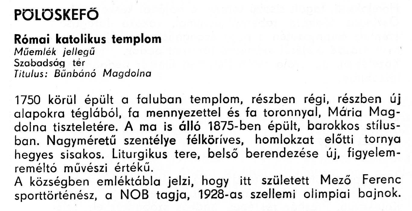 Nyilvános 2076 | 5289 | Pölöskefő - Zala megye műemlékei 1977 081old | A részlet szövege: PÖLÖSKEFÖ Római katolikus templom Műemlék jellegű Szabadság tér Titulus: Bűnbánó Magdolna 1750 körül épült a faluban templom, részben régi, részben új alapokra téglából, fa mennyezettel és fa toronnyal, Mária Magdolna tiszteletére. A ma is álló 1875-ben épült, barokkos stílusban. Nagyméretű szentélye félköríves, homlokzat előtti tornya hegyes sisakos. Liturgikus tere, belső berendezése új, figyelemreméltó művészi értékű. A községben emléktábla jelzi, hogy itt született Mező Ferenc sporttörténész, a NOB tagja, 1928-as szellemi olimpiai bajnok. A részlet a következő könyvből származik: Cím: Zala megye műemlékei Szerző: Németh József (1928) Közreműködő: Lantos Miklós (fotó) Szerz. közl.: Németh József ; [fotók... Lantos Miklós] Kiadás: Zalaegerszeg : Zalai Ny., 1977 ETO jelzet: 72(439.121) ; 7.025.3/.4 ; 908.439.121 Tárgyszó: Zala megye Szakjelzet: 908 Cutter: N 53 Nyelv: magyar Oldalszám: 109 p. |