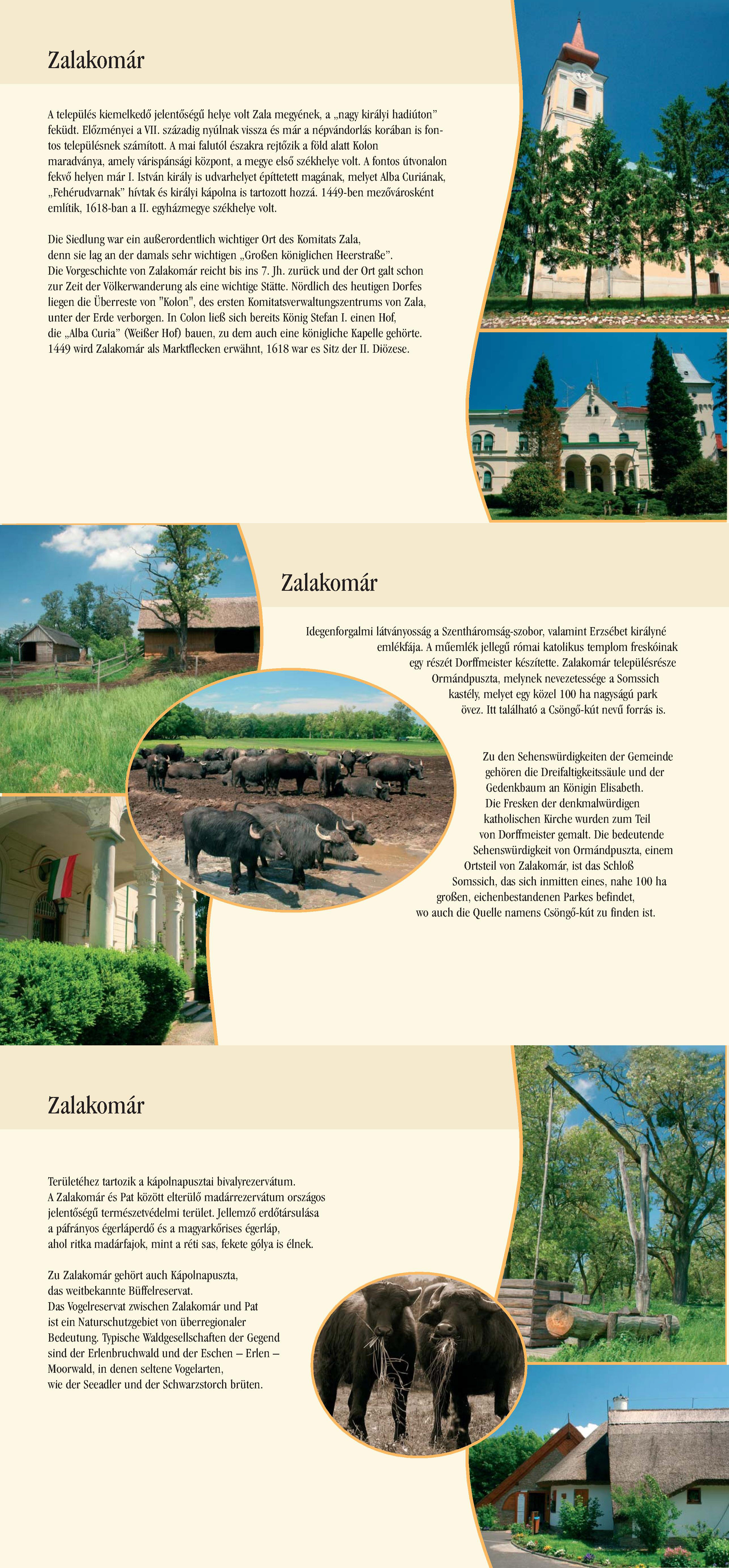 Nyilvános 1808 | 5396 | Zalakomár | Die Siedlung war ein außerordentlich wichtiger Ort des Komitats Zala, denn sie lag an der damals sehr wichtigen ,,Großen königlichen Heerstraße". Die Vorgeschichte von Zalakomár reicht bis ins 7. Jh. zurück und der Ort galt schon zur Zeit der Völkerwanderung als eine wichtige Stätte. Nördlich des heutigen Dorfes liegen die Überreste von "Kolon", des ersten Komitatsverwaltungszentrums von Zala, unter der Erde verborgen. In Colon ließ sich bereits König Stefan I. einen Hof, die ,,Alba Curia" (Weißer Hof) bauen, zu dem auch eine königliche Kapelle gehörte. 1449 wird Zalakomár als Marktflecken erwähnt, 1618 war es Sitz der II. Diözese. Zu den Sehenswürdigkeiten der Gemeinde gehören die Dreifaltigkeitssäule und der Gedenkbaum an Königin Elisabeth. Die Fresken der denkmalwürdigen katholischen Kirche wurden zum Teil von Dorffmeister gemalt. Die bedeutende Sehenswürdigkeit von Ormándpuszta, einem Ortsteil von Zalakomár, ist das Schloß Somssich, das sich inmitten eines, nahe 100 ha großen, eichenbestandenen Parkes befindet, wo auch die Quelle namens Csöngő-kút zu finden ist. Zu Zalakomár gehört auch Kápolnapuszta, das weitbekannte Büffelreservat. Das Vogelreservat zwischen Zalakomár und Pat ist ein Naturschutzgebiet von überregionaler Bedeutung. Typische Waldgesellschaften der Gegend sind der Erlenbruchwald und der Eschen - Erlen - Moorwald, in denen seltene Vogelarten, wie der Seeadler und der Schwarzstorch brüten. Dieses Text stammt von: Pannonhát tájpark prospektus 2006. Web: http://www.pannonhat.hu/ (auch in Deutsch) |