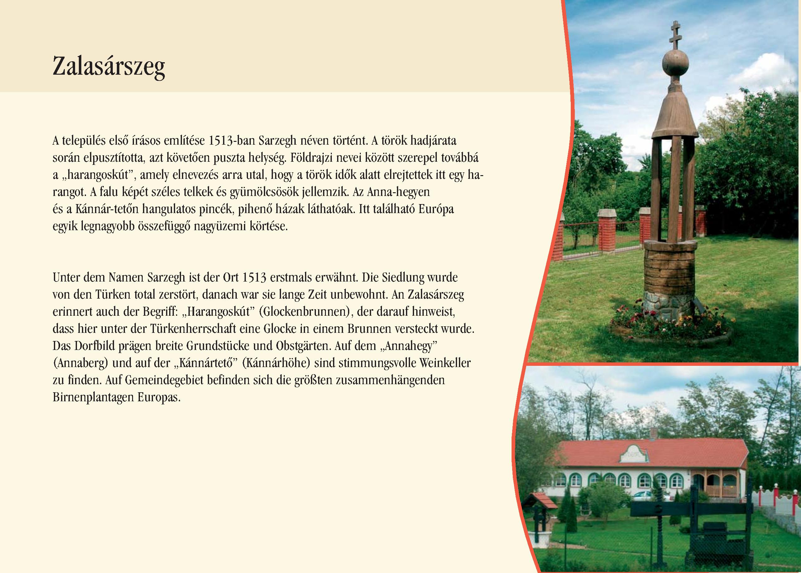 Nyilvános 2090 | 5910 | Zalasárszeg | Unter dem Namen Sarzegh ist der Ort 1513 erstmals erwähnt. Die Siedlung wurde von den Türken total zerstört, danach war sie lange Zeit unbewohnt. An Zalasárszeg erinnert auch der Begriff: ,,Harangoskút" (Glockenbrunnen), der darauf hinweist, dass hier unter der Türkenherrschaft eine Glocke in einem Brunnen versteckt wurde. Das Dorfbild prägen breite Grundstücke und Obstgärten. Auf dem ,,Annahegy" (Annaberg) und auf der ,,Kánnártető" (Kánnárhöhe) sind stimmungsvolle Weinkeller zu finden. Auf Gemeindegebiet befinden sich die größten zusammenhängenden Birnenplantagen Europas. Dieses Text stammt von: Pannonhát tájpark prospektus 2006. Web: http://www.pannonhat.hu/ (auch in Deutsch) |
