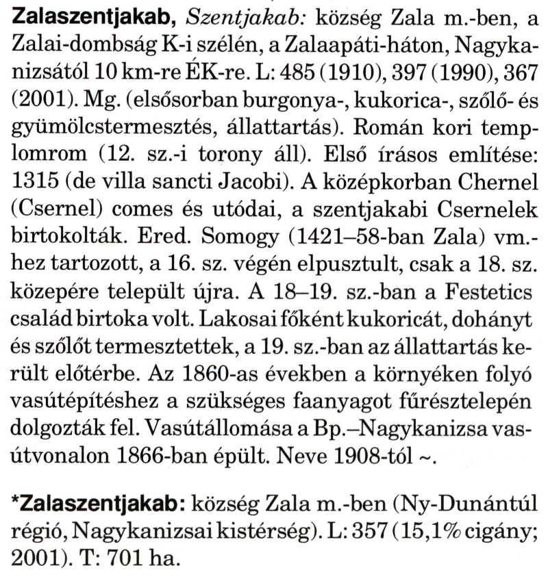 Nyilvános 1811 | 5254 | A szócikkek felismertetett szövege: | (A csillag után a kiegészítő kötetből származó szöveg következik) Zalaszentjakab, Szentjakab: község Zala m.-ben, a Zalai-dombság K-i szélén, a Zalaapáti-háton, Nagykanizsától 10 km-re ÉK-re. L: 485 (1910), 397 (1990), 367 (2001). Mg. (elsősorban burgonya-, kukorica-, szőlő- és gyümölcstermesztés, állattartás). Román kori templomrom (12. sz.-i torony áll). Első írásos említése: 1315 (de villa sancti Jacobi). A középkorban Chernel (Csernel) comes és utódai, a szentjakabi Csernelek birtokolták. Ered. Somogy (1421-58-ban Zala) vm.-hez tartozott, a 16. sz. végén elpusztult, csak a 18. sz. közepére települt újra. A 18—19. sz.-ban a Festetics család birtoka volt. Lakosai főként kukoricát, dohányt és szőlőt termesztettek, a 19. sz.-ban az állattartás került előtérbe. Az 1860-as években a környéken folyó vasútépítéshez a szükséges faanyagot fűrésztelepén dolgozták fel. Vasútállomása a Bp.-Nagykanizsa vasútvonalon 1866-ban épült. Neve 1908-tól ~. *Zalaszentjakab: község Zala m.-ben (Ny-Dunántúl régió, Nagykanizsai kistérség). L: 357 (15,1% cigány; 2001). T: 701 ha. A szócikkek a következő lexikonból származnak: Cím: Magyar nagylexikon Közreműködő: Élesztős László (1949) (szerk.) ; Barabás Éva (1943) (szerk.) ; Berényi Gábor (1946) (szerk.) ; Bárány Lászlóné (szerk.) ; Adelmann-né Kertész Judit (1945) (közrem.) ; Froemel Károlyné Jáky Éva (1936) (közrem.) ; Akadémiai Kiadó és Nyomda Vállala Szerz. közl.: [... Élesztős László főszerk.] ; [szerk. Barabás Éva et al.] ; [bibliogr. Adelmanné Kertész Judit] ; [kész. az Akadémiai Kiadó Magyar Nagylexikon Szerkesztőségében] Kiadás: Budapest : Akad. K., 1993- Kötetei: 1. köt., A - Anc 2. köt., And - Bag 3. köt., Bah - Bij 4. köt., Bik - Bz 5. köt., C - Csem 6. köt., Csen - Ec 7. köt., Ed - Fe 8. köt., Ff - Gyep 9. köt., Gyer - Iq 10. köt., Ir - Kip 11. köt., Kir - Lem 12. köt., Len - Mep 13. köt., Mer - Nyk 14. köt., Nyl - Pom 15. köt., Pon - Sek 16. köt., Sel - Szö 17. köt., Szp - Ung 18. köt., Unh - Z 19. köt., Kiegészítő kötet, A - Z ETO jelzet: 030=945.11 Szakjelzet: 030 Cutter: M 14 ISBN: 963-05-6611-7 [!ISBN 963-05-6615-X] Nyelv: magyar Megjegyzés: Az 5. kötettől kiad. a Magyar Nagylexikon Kiadó ; A 6. kötettől főszerk. Berényi Gábor ; A 6. kötettől szakszerk. Bárány Lászlóné et al. ; A 6. kötettől bibliogr. Froemel Károlyné ; Bibliogr. a szócikkek végén |