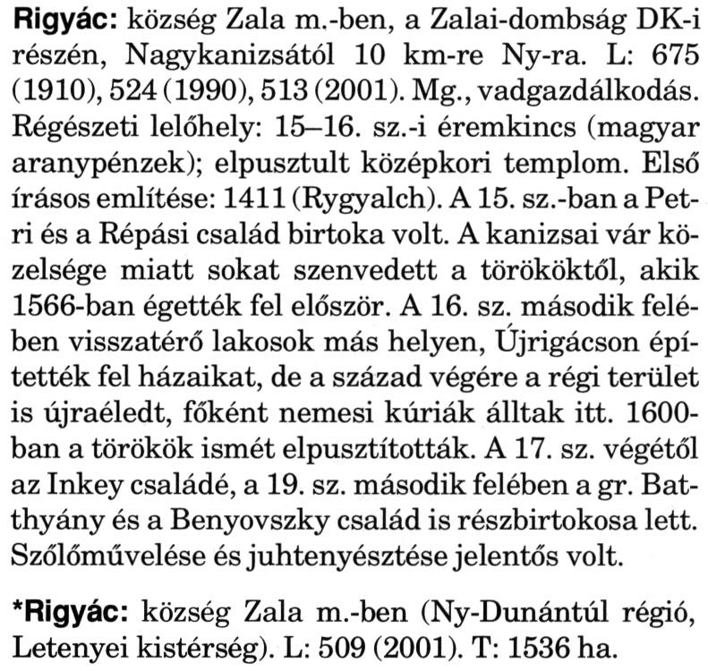 Nyilvános 2140 | 6025 | A szócikkek felismertetett szövege: | (A csillag után a kiegészítő kötetből származó szöveg következik) Rigyác: község Zala m.-ben, a Zalai-dombság DK-i részén, Nagykanizsától 10 km-re Ny-ra. L: 675 (1910), 524 (1990), 513 (2001). Mg., vadgazdálkodás. Régészeti lelőhely: 15-16. sz.-i éremkincs (magyar aranypénzek); elpusztult középkori templom. Első írásos említése: 1411 (Rygyalch). A 15. sz.-ban a Pet-ri és a Répási család birtoka volt. A kanizsai vár közelsége miatt sokat szenvedett a törököktől, akik 1566-ban égették fel először. A 16. sz. második felében visszatérő lakosok más helyen, Újrigácson építették fel házaikat, de a század végére a régi terület is újraéledt, főként nemesi kúriák álltak itt. 1600-ban a törökök ismét elpusztították. A 17. sz. végétől az Inkey családé, a 19. sz. második felében a gr. Batthyány és a Benyovszky család is részbirtokosa lett. Szőlőművelése és juhtenyésztése jelentős volt. *Rigyác: község Zala m.-ben (Ny-Dunántúl régió, Letenyei kistérség). L: 509 (2001). T: 1536 ha. A szócikkek a következő lexikonból származnak: Cím: Magyar nagylexikon Közreműködő: Élesztős László (1949) (szerk.) ; Barabás Éva (1943) (szerk.) ; Berényi Gábor (1946) (szerk.) ; Bárány Lászlóné (szerk.) ; Adelmann-né Kertész Judit (1945) (közrem.) ; Froemel Károlyné Jáky Éva (1936) (közrem.) ; Akadémiai Kiadó és Nyomda Vállala Szerz. közl.: [... Élesztős László főszerk.] ; [szerk. Barabás Éva et al.] ; [bibliogr. Adelmanné Kertész Judit] ; [kész. az Akadémiai Kiadó Magyar Nagylexikon Szerkesztőségében] Kiadás: Budapest : Akad. K., 1993- Kötetei: 1. köt., A - Anc 2. köt., And - Bag 3. köt., Bah - Bij 4. köt., Bik - Bz 5. köt., C - Csem 6. köt., Csen - Ec 7. köt., Ed - Fe 8. köt., Ff - Gyep 9. köt., Gyer - Iq 10. köt., Ir - Kip 11. köt., Kir - Lem 12. köt., Len - Mep 13. köt., Mer - Nyk 14. köt., Nyl - Pom 15. köt., Pon - Sek 16. köt., Sel - Szö 17. köt., Szp - Ung 18. köt., Unh - Z 19. köt., Kiegészítő kötet, A - Z ETO jelzet: 030=945.11 Szakjelzet: 030 Cutter: M 14 ISBN: 963-05-6611-7 [!ISBN 963-05-6615-X] Nyelv: magyar Megjegyzés: Az 5. kötettől kiad. a Magyar Nagylexikon Kiadó ; A 6. kötettől főszerk. Berényi Gábor ; A 6. kötettől szakszerk. Bárány Lászlóné et al. ; A 6. kötettől bibliogr. Froemel Károlyné ; Bibliogr. a szócikkek végén |