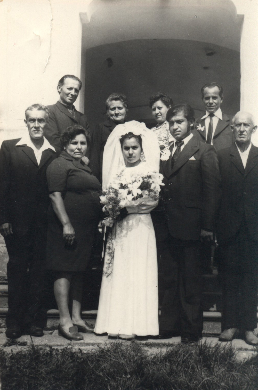 Nyilvános 1477 | 3780 | Kiskomáromi templom előtt. 1975-80-as évek. Baranyai György és Csizmadia Mária esküvője. | Balról jobbra, első sor: Csizmadia Géza, Csizmadia Gézáné, Baranyai Györgyné, Baranyai György, Baranyai István Hátsó sor: 1-2. nem ismert 3. Horváht Istvánné, 4. Horváth István |