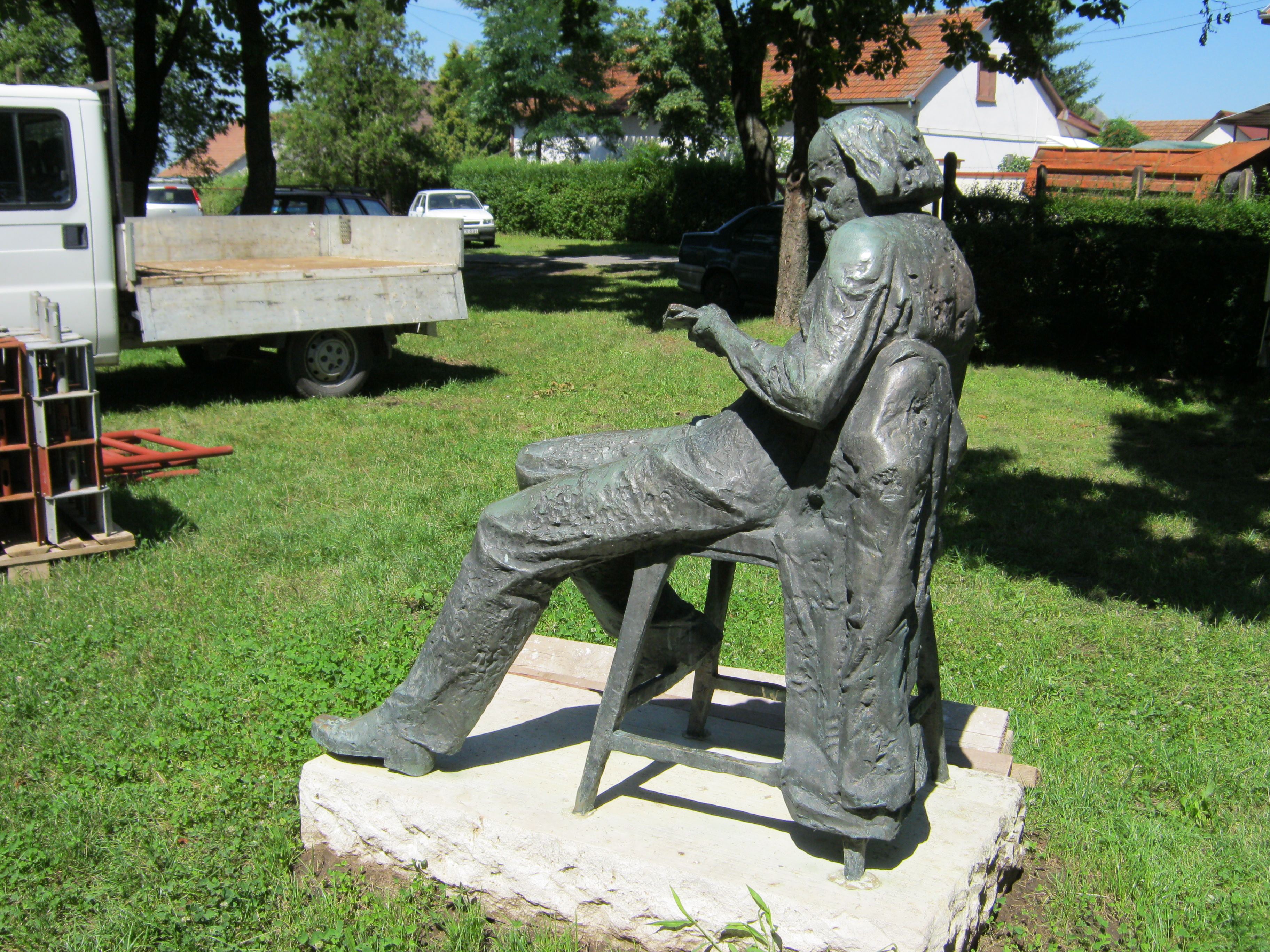 Nyilvános 969 | 1369 | Nyírbátor, Báthori utca 24. mögött: Kodály Zoltán | A református templom háta mögött két zeneszerző szobra látható. Kodály Zoltán egészalakos ülő szobrát, Kirchmayer Károly alkotását 1983-ban állították fel. Nem találtam erre vonatkozó információt, de a szobornak valószínűleg köze van a Nyírbátori Zenei Napokhoz. A református templomban, mint ideális helyszínen többször felhangzott Kodály Psalmus Hungaricusa. Az egyik előadást - Simándy József tenorszólójával - televíziós felvétel is megörökítette. Felh. irod.: www.szoborlap.hu A fénykép 2010 augusztus elején, amint látható is, a templom helyreállítási munkálatai idején készült. |