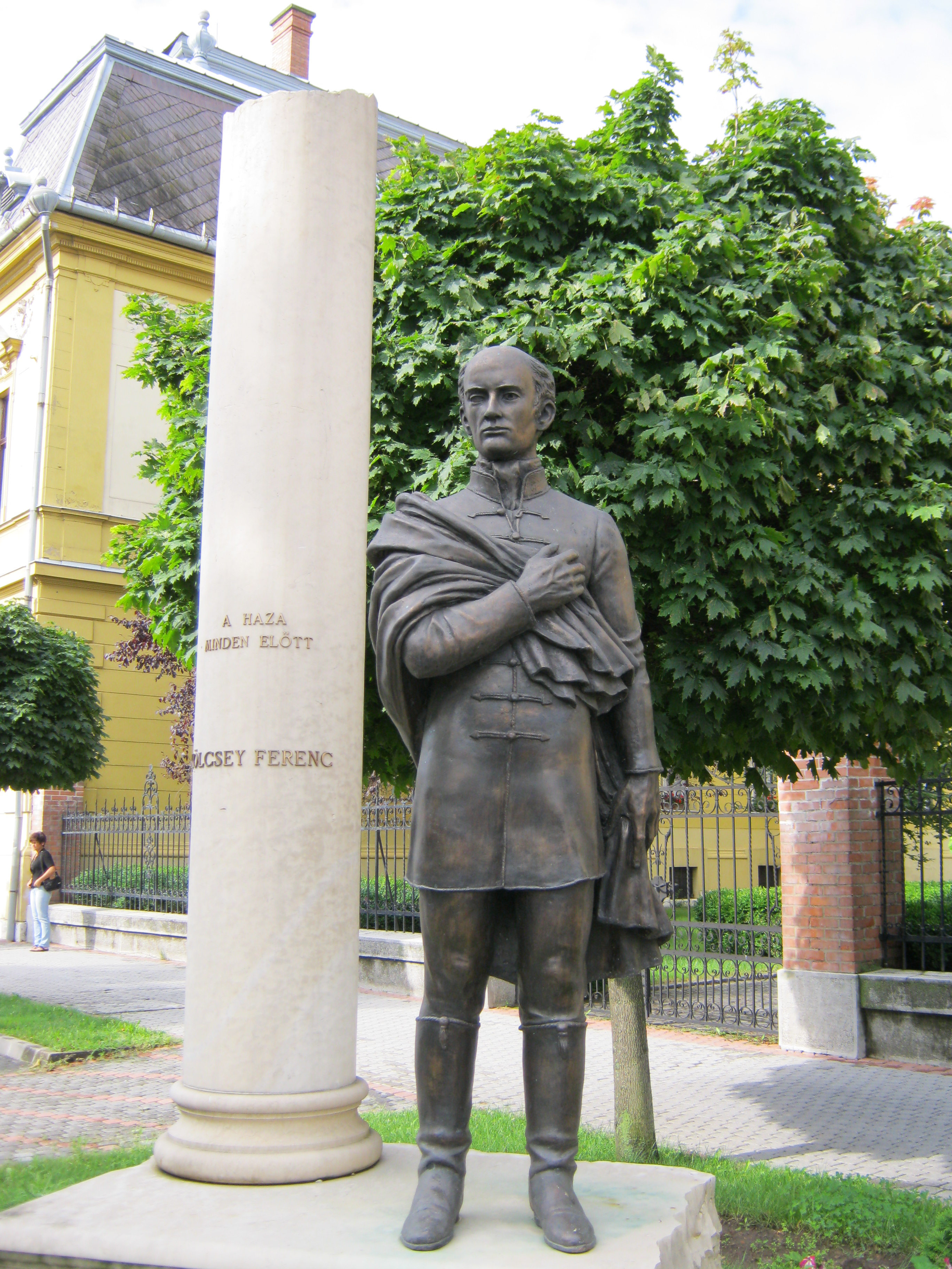 Nyilvános 956 | 1399 | Nyíregyháza, Hősök tere 5. Megyeháza | Az eklektikus stílusú megyeháza 1891-1892-ben, Alpár Ignác tervei szerint épült. Homlokzatát Szabolcs vezér és az államalapító István király szobrai díszítik. Az épületplasztikák és díszítmények Verán József munkái. Nyíregyháza 1876-ban lett megyeszékhely, korábban Nagykálló töltötte be ezt a szerepet. Az épület előtt 2008-ban állították fel Bíró Lajos Kölcsey Ferencet megjelenítő szoborkompozícióját. A költőt szívre tett kézzel ábrázoló köztéri alkotást a Himnusz születésének 185. és Kölcsey halálának 170. évfordulójára emlékezve emelték. Az oszlop felirata: A haza minden előtt. Kölcsey Szatmár vármegye főjegyzője és országgyűlési követe volt. Szabadelvű politikusként a nemzeti függetlenségért, a polgári és emberi jogokért, a jobbágyfelszabadításért, a nemzeti egységért, a vallási egyenjogúságért és türelemért, a magyar nyelv hivatalossá tételéért dolgozott. Tiltakozásul a vármegye felszólítására, hogy az örökváltság ellen szavazzon, képes volt lemondani politikai karrierjéről. Felh. irod.: Látnivalók Szabolcs-Szatmár-Bereg megyében. Miskolc, Well-PRess, 1999 www.szoborlap.hu A fénykép 2010 augusztus elején készült. |