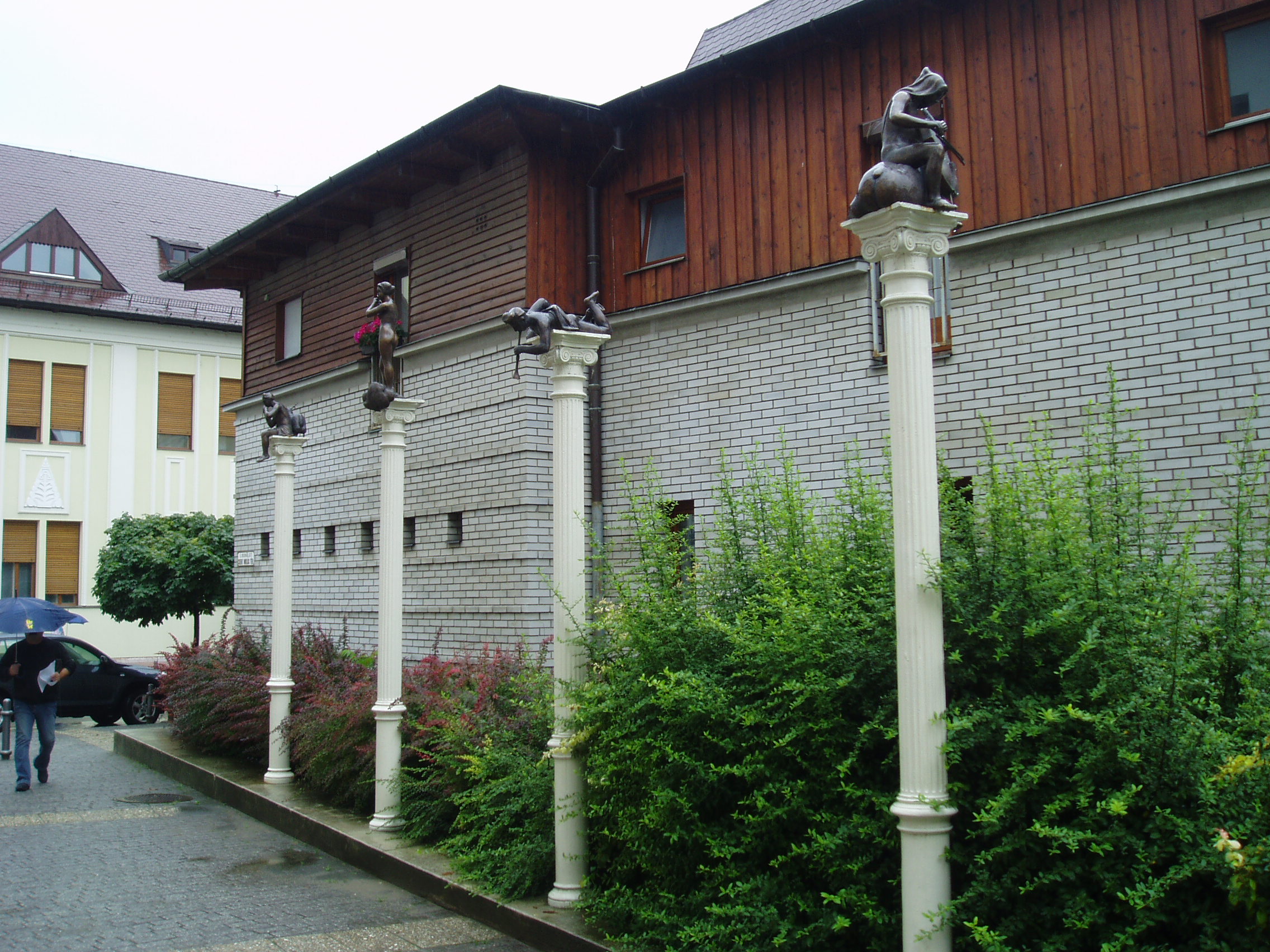 Nyilvános 965 | 2862 | Nyíregyháza, Szent Miklós tér: Szent Miklós szobra | A Szent Miklós tér Tóth Sándor Szent Miklós szobra mellett más látnivalókat is kínál. 2009 szeptemberében helyezték el Zagyva László négy, a négy évszakot muzsikálók alakjában megjelenítő szobrait a téren álló görög stílű oszlopokon. Felhaszn. irod.: www.szoborlap.hu A fénykép 2010 augusztus elején készült |