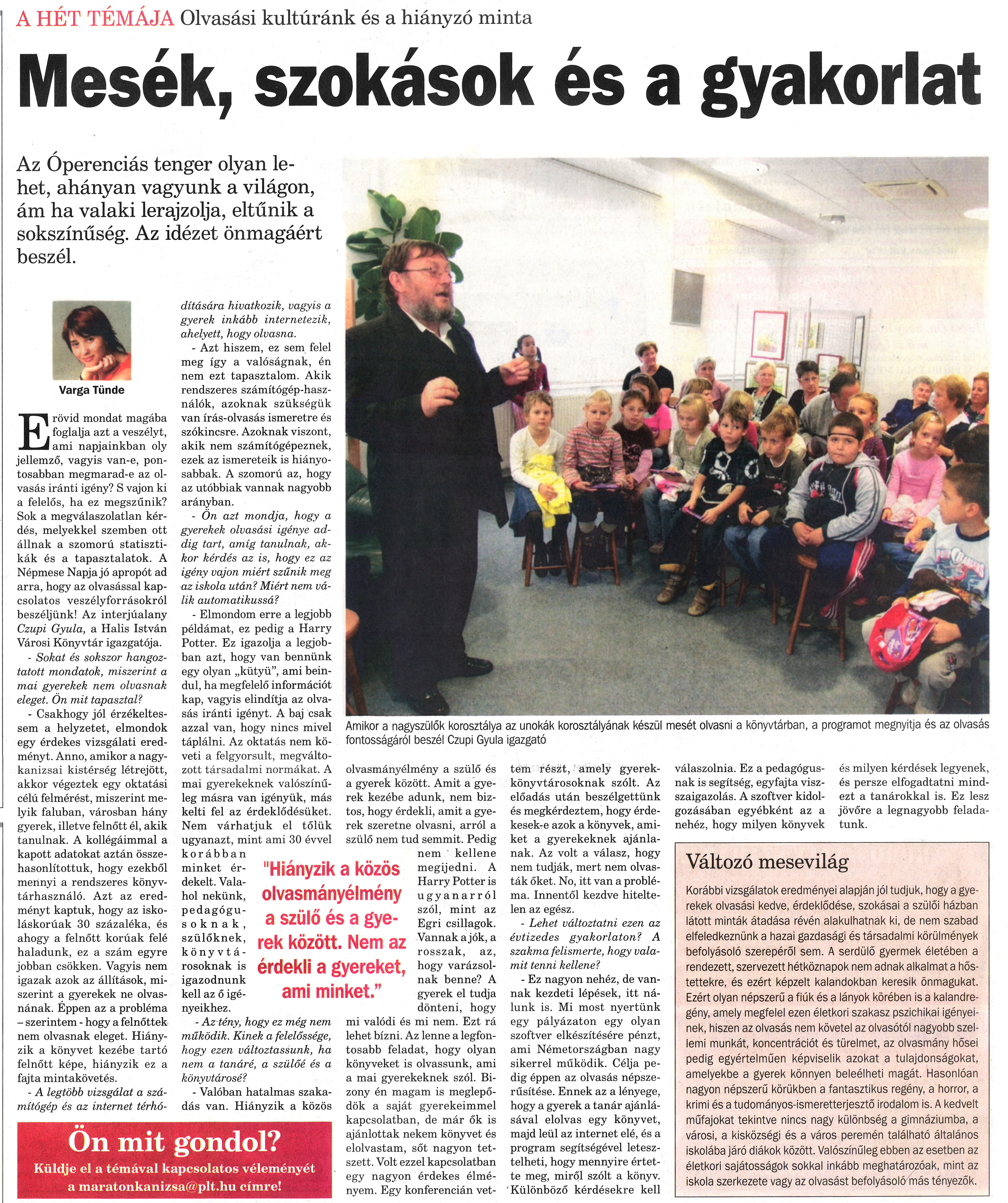 Nyilvános 1207 | 1698 | Nagykanizsai Maraton 2009. október 2. 39. szám 3. oldal - Mesék, szokások és a gyakorlat - A hét témája: olvasási kultúránk és a hiányzó minta | A cikk szövege: A HÉT TÉMÁJA Olvasási kultúránk és a hiányzó minta Mesék, szokások és a gyakorlat "Hiányzik a közös olvasmányélmény a szülő és a gyerek között. Nem az érdekli a gyereket, ami minket." Varga Tünde Az Óperenciás tenger olyan lehet, ahányan vagyunk a világon, ám ha valaki lerajzolja, eltűnik a sokszínűség. Az idézet önmagáért beszél. E rövid mondat magába foglalja azt a veszélyt, ami napjainkban oly jellemző, vagyis van-e, pontosabban megmarad-e az olvasás iránti igény? S vajon ki a felelős, ha ez megszűnik? Sok a megválaszolatlan kérdés, melyekkel szemben ott állnak a szomorú statisztikák és a tapasztalatok. A Népmese Napja jó apropót ad arra, hogy az olvasással kapcsolatos veszélyforrásokról beszéljünk! Az interjúalany Czupi Gyula, a Halis István Városi Könyvtár igazgatója. - Sokat és sokszor hangoztatott mondatok, miszerint a mai gyerekek nem olvasnak eleget. Ön mit tapasztal? - Csakhogy jól érzékeltessem a helyzetet, elmondok egy érdekes vizsgálati eredményt. Anno, amikor a nagykanizsai kistérség létrejött, akkor végeztek egy oktatási célú felmérést, miszerint melyik faluban, városban hány gyerek, illetve felnőtt él, akik tanulnak. A kollégáimmal a kapott adatokat aztán összehasonlítottuk, hogy ezekből mennyi a rendszeres könyvtárhasználó. Azt az eredményt kaptuk, hogy az iskoláskorúak 30 százaléka, és ahogy a felnőtt korúak felé haladunk, ez a szám egyre jobban csökken. Vagyis nem igazak azok az állítások, miszerint a gyerekek ne olvasnának. Éppen az a probléma - szerintem - hogy a felnőttek nem olvasnak eleget. Hiányzik a könyvet kezébe tartó felnőtt képe, hiányzik ez a fajta mintakövetés. - A legtöbb vizsgálat a számítógép és az internet térhódítására hivatkozik, vagyis a gyerek inkább internetezik, ahelyett, hogy olvasna. - Azt hiszem, ez sem felel meg így a valóságnak, én nem ezt tapasztalom. Akik rendszeres számítógép-használók, azoknak szükségük van írás-olvasás ismeretre és szókincsre. Azoknak viszont, akik nem számítógépeznek, ezek az ismereteik is hiányosabbak. A szomorú az, hogy az utóbbiak vannak nagyobb arányban. - Ön azt mondja, hogy a gyerekek olvasási igénye addig tart, amíg tanulnak, akkor kérdés az is, hogy ez az igény vajon miért szűnik meg az iskola után? Miért nem válik automatikussá? - Elmondom erre a legjobb példámat, ez pedig a Harry Potter. Ez igazolja a legjobban azt, hogy van bennünk egy olyan „kütyü”, ami beindul, ha megfelelő információt kap, vagyis elindítja az olvasás iránti igényt. A baj csak azzal van, hogy nincs mivel táplálni. Az oktatás nem követi a felgyorsult, megváltozott társadalmi normákat. A mai gyerekeknek valószínűleg másra van igényük, más kelti fel az érdeklődésüket. Nem várhatjuk el tőlük ugyanazt, mint ami 30 évvel korábban minket érdekelt. Valahol nekünk, pedagógusoknak, szülőknek, könyvtárosoknak is igazodnunk kell az ő igényeikhez. - Az tény, hogy ez még nem működik. Kinek a felelőssége, hogy ezen változtassunk, ha nem a tanáré, a szülőé és a könyvtárosé? - Valóban hatalmas szakadás van. Hiányzik a közös olvasmányélmény a szülő és a gyerek között. Amit a gyerek kezébe adunk, nem biztos, hogy érdekli, amit a gyerek szeretne olvasni, arról a szülő nem tud semmit. Pedig nem kellene megijedni. A Harry Potter is ugyanarról szól, mint az Egri csillagok. Vannak a jók, a rosszak, az, hogy varázsolnak benne? A gyerek el tudja dönteni, hogy mi valódi és mi nem. Ezt rá lehet bízni. Az lenne a legfontosabb feladat, hogy olyan könyveket is olvassunk, ami a mai gyerekeknek szól. Bizony én magam is meglepődök a saját gyerekeimmel kapcsolatban, de már ők is ajánlottak nekem könyvet és elolvastam, sőt nagyon tetszett. Volt ezzel kapcsolatban egy nagyon érdekes élményem. Egy konferencián vettem részt, amely gyerekkönyvtárosoknak szólt. Az előadás után beszélgettünk és megkérdeztem, hogy érdekesek-e azok a könyvek, amiket a gyerekeknek ajánlanak. Az volt a válasz, hogy nem tudják, mert nem olvasták őket. No, itt van a probléma. Innentől kezdve hiteltelen az egész. - Lehet változtatni ezen az évtizedes gyakorlaton? A szakma felismerte, hogy valamit tenni kellene? - Ez nagyon nehéz, de vannak kezdeti lépések, itt nálunk is. Mi most nyertünk egy pályázaton egy olyan szoftver elkészítésére pénzt, ami Németországban nagy sikerrel működik. Célja pedig éppen az olvasás népszerűsítése. Ennek az a lényege, hogy a gyerek a tanár ajánlásával elolvas egy könyvet, majd leül az internet elé, és a program segítségével letesztelheti, hogy mennyire értette meg, miről szólt a könyv. Különböző kérdésekre kell válaszolnia. Ez a pedagógusnak is segítség, egyfajta visszaigazolás. A szoftver kidolgozásában egyébként az a nehéz, hogy milyen könyvek és milyen kérdések legyenek, és persze elfogadtatni mindezt a tanárokkal is. Ez lesz jövőre a legnagyobb feladatunk. Változó mesevilág Korábbi vizsgálatok eredményei alapján jól tudjuk, hogy a gyerekek olvasási kedve, érdeklődése, szokásai a szülői házban látott minták átadása révén alakulhatnak ki, de nem szabad elfeledkeznünk a hazai gazdasági és társadalmi körülmények befolyásoló szerepéről sem. A serdülő gyermek életében a rendezett, szervezett hétköznapok nem adnak alkalmat a hőstettekre, és ezért képzelt kalandokban keresik önmagukat. Ezért olyan népszerű a fiúk és a lányok körében is a kalandregény, amely megfelel ezen életkori szakasz pszichikai igényeinek, hiszen az olvasás nem követel az olvasótól nagyo