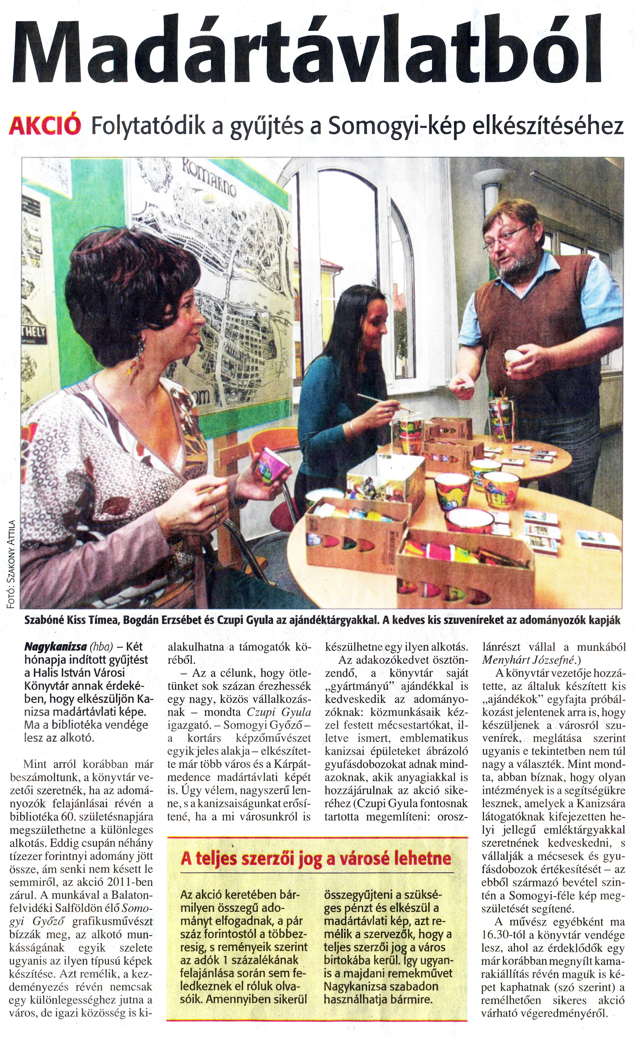 Nyilvános 1060 | 1342 | Zalai Hírlap 2009. november 17. 269. szám 11. oldal - Madártávlatból | A cikk szövege: Madártávlatból AKCIÓ Folytatódik a gyűjtés a Somogyi-kép elkészítéséhez Szabóné Kiss Tímea, Bogdán Erzsébet és Czupi Gyula az ajándéktárgyakkal. A kedves kis szuveníreket az adományozók kapják Nagykanizsa (hba) - Két hónapja indított gyűjtést a Halis István Városi Könyvtár annak érdekében, hogy elkészüljön Kanizsa madártávlati képe. Ma a bibliotéka vendége lesz az alkotó. Mint arról korábban már beszámoltunk, a könyvtár vezetői szeretnék, ha az adományozók felajánlásai révén a bibliotéka 60. születésnapjára megszülethetne a különleges alkotás. Eddig csupán néhány tízezer forintnyi adomány jött össze, ám senki nem késett le semmiről, az akció 2011-ben zárul. A munkával a Balatonfelvidéki Salföldön élő Somogyi Győző grafikusművészt bízzák meg, az alkotó munkásságának egyik szelete ugyanis az ilyen típusú képek készítése. Azt remélik, a kezdeményezés révén nemcsak egy különlegességhez jutna a város, de igazi közösség is kialakulhatna a támogatók köréből. - Az a célunk, hogy ötletünket sok százan érezhessék egy nagy, közös vállalkozásnak - mondta Czupi Gyula igazgató. - Somogyi Győző -a kortárs képzőművészet egyik jeles alakja - elkészítette már több város és a Kárpátmedence madártávlati képét is. Úgy vélem, nagyszerű lenne, s a kanizsaiságunkat erősítené, ha a mi városunkról is készülhetne egy ilyen alkotás. Az adakozókedvet ösztönzendő, a könyvtár saját „gyártmányú" ajándékkal is kedveskedik az adományozóknak: közmunkásaik kézzel festett mécsestartókat, illetve ismert, emblematikus kanizsai épületeket ábrázoló gyufásdobozokat adnak mindazoknak, akik anyagiakkal is hozzájárulnak az akció sikeréhez (Czupi Gyula fontosnak tartotta megemlíteni: oroszlánrészt vállal a munkából Menyhárt Józsefné!) A könyvtár vezetője hozzátette, az általuk készített kis „ajándékok" egyfajta próbálkozást jelentenek arra is, hogy készüljenek a városról szuvenírek, meglátása szerint ugyanis e tekintetben nem túl nagy a választék. Mint mondta, abban bíznak, hogy olyan intézmények is a segítségükre lesznek, amelyek a Kanizsára látogatóknak kifejezetten helyi jellegű emléktárgyakkal szeretnének kedveskedni, s vállalják a mécsesek és gyu-fásdobozok értékesítését - az ebből származó bevétel szintén a Somogyi-féle kép megszületését segítené. A művész egyébként ma 16.30-tól a könyvtár vendége lesz, ahol az érdeklődők egy már korábban megnyílt kamarakiállítás révén maguk is képet kaphatnak (szó szerint) a remélhetően sikeres akció várható végeredményéről. A teljes szerzői jog a városé lehetne Az akció keretében bármilyen összegű adományt elfogadnak, a pár száz forintostól a többezresig, s reményeik szerint az adók 1 százalékának felajánlása során sem feledkeznek el róluk olvasóik. Amennyiben sikerül összegyűjteni a szükséges pénzt és elkészül a madártávlati kép, azt remélik a szervezők, hogy a teljes szerzői jog a város birtokába kerül. Így ugyanis a majdani remekművet Nagykanizsa szabadon használhatja bármire. |