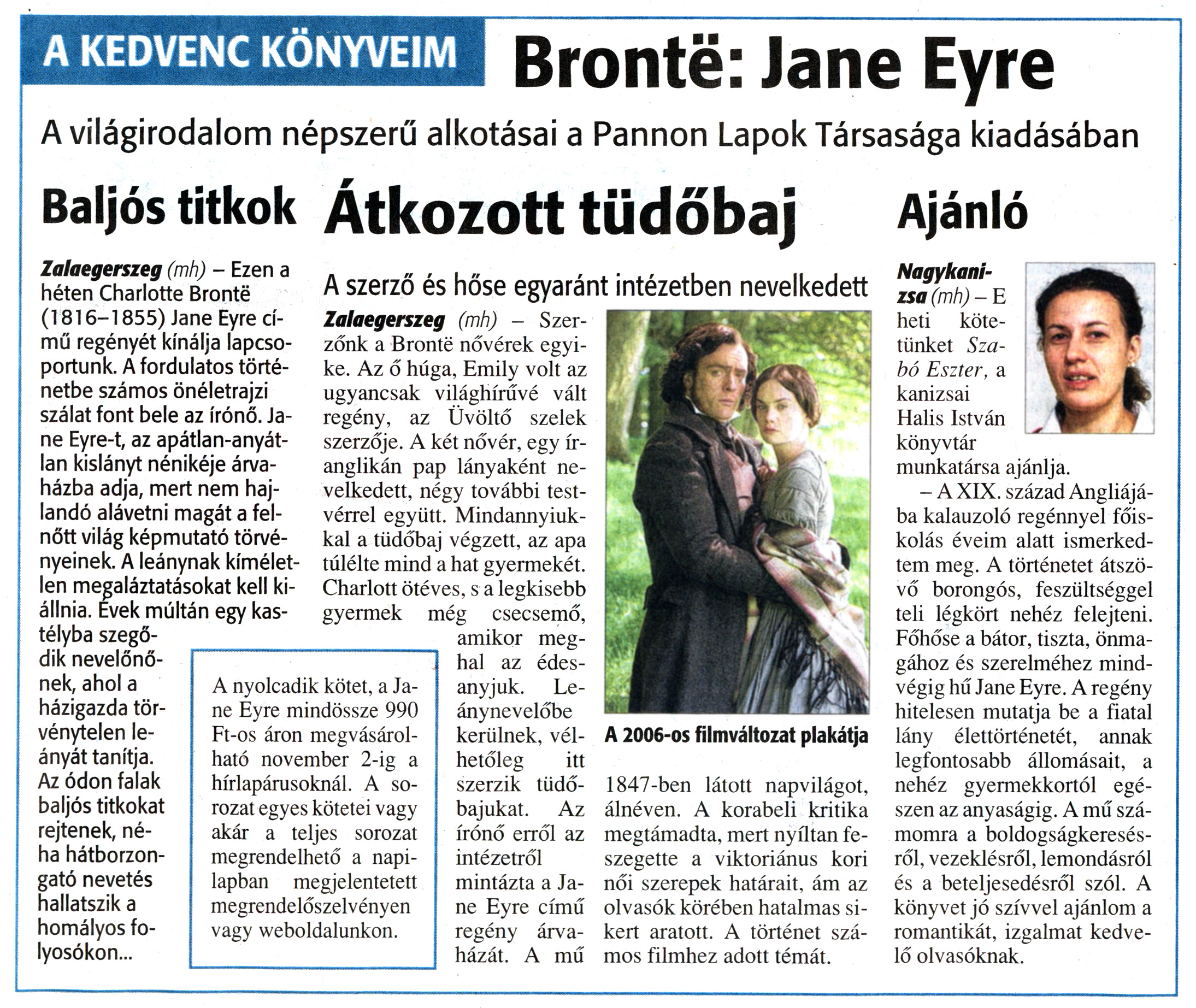 Nyilvános 1064 | 1231 | Zalai Hírlap 2010. október 27. 250. szám 7. oldal - Könyvajánló | A cikk szövege: A KEDVENC KÖNYVEIM Bronte: Jane Eyre A világirodalom népszerű alkotásai a Pannon Lapok Társasága kiadásában Baljós titkok Zalaegerszeg (mh) - Ezen a héten Charlotte Bronté (1816-1855) Jane Eyre című regényét kínálja lapcsoportunk. A fordulatos történetbe számos önéletrajzi szálat font bele az írónő. Jane Eyre-t, az apátlan-anyátlan kislányt nénikéje árvaházba adja, mert nem hajlandó alávetni magát a felnőtt világ képmutató törvényeinek. A leánynak kíméletlen megaláztatásokat kell kiállnia. Evek múltán egy kastélyba szegődik nevelőnőnek, ahol a házigazda törvénytelen leányát tanítja. Az ódon falak baljós titkokat rejtenek, néha hátborzongató nevetés hallatszik a homályos folyosókon... A nyolcadik kötet, a Jane Eyre mindössze 990 Ft-os áron megvásárolható november 2-ig a hírlapárusoknál. A sorozat egyes kötetei vagy akár a teljes sorozat megrendelhető a napilapban megjelentetett megrendelőszelvényen vagy weboldalunkon. Átkozott tüdőbaj A szerző és hőse egyaránt intézetben nevelkedett Zalaegerszeg (mh) - Szerzőnk a Bronte nővérek egyike. Az ő húga, Emily volt az ugyancsak világhírűvé vált regény, az Üvöltő szelek szerzője. A két nővér, egy ír-anglikán pap lányaként nevelkedett, négy további testvérrel együtt. Mindannyiukkal a tüdőbaj végzett, az apa túlélte mind a hat gyermekét. Charlott ötéves, s a legkisebb gyermek még csecsemő, amikor meg- hal az édesanyjuk. Leánynevelőbe kerülnek, vélhetőleg itt szerzik tüdőbajukat. Az írónő erről az intézetről mintázta a Jane Eyre című regény árvaházát. A mű A 2006-os filmváltozat plakátja 1847-ben látott napvilágot, álnéven. A korabeli kritika megtámadta, mert nyíltan feszegette a viktoriánus kori női szerepek határait, ám az olvasók körében hatalmas sikert aratott. A történet számos filmhez adott témát. Ajánló Nagykanizsa (mh) - E heti kötetünket Szabó Eszter, a kanizsai Halis István könyvtár munkatársa ajánlja. - A XIX. század Angliájába kalauzoló regénnyel főiskolás éveim alatt ismerkedtem meg. A történetet átszövő borongós, feszültséggel teli légkört nehéz felejteni. Főhőse a bátor, tiszta, önmagához és szerelméhez mindvégig hű Jane Eyre. A regény hitelesen mutatja be a fiatal lány élettörténetét, annak legfontosabb állomásait, a nehéz gyermekkortól egészen az anyaságig. A mű számomra a boldogságkeresésről, vezeklésről, lemondásról és a beteljesedésről szól. A könyvet jó szívvel ajánlom a romantikát, izgalmat kedvelő olvasóknak. |