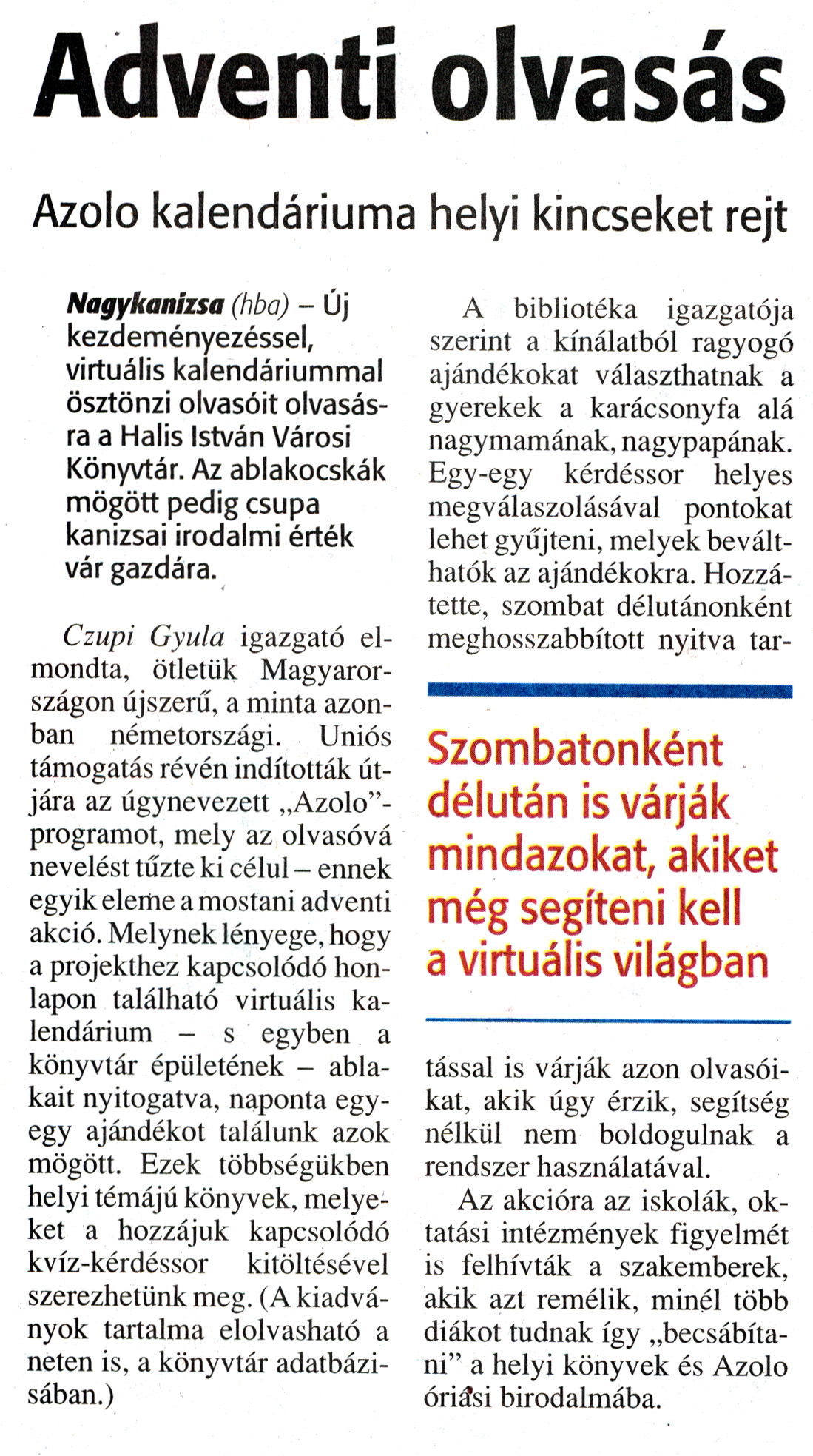 Nyilvános 1757 | 4701 | Zalai Hírlap 2010. december 7. 284. szám 11. oldal - Adventi olvasás | A cikk szövege: Adventi olvasás Azolo kalendáriuma helyi kincseket rejt Nagykanizsa (hba) - Új kezdeményezéssel, virtuális kalendáriummal ösztönzi olvasóit olvasásra a Halis István Városi Könyvtár. Az ablakocskák mögött pedig csupa kanizsai irodalmi érték vár gazdára. Czupi Gyula igazgató elmondta, ötletük Magyarországon újszerű, a minta azonban németországi. Uniós támogatás révén indították útjára az úgynevezett „Azolo"-programot, mely az olvasóvá nevelést tűzte ki célul - ennek egyik eleme a mostani adventi akció. Melynek lényege, hogy a projekthez kapcsolódó honlapon található virtuális kalendárium - s egyben a könyvtár épületének - ablakait nyitogatva, naponta egy-egy ajándékot találunk azok mögött. Ezek többségükben helyi témájú könyvek, melyeket a hozzájuk kapcsolódó kvíz-kérdéssor kitöltésével szerezhetünk meg. (A kiadványok tartalma elolvasható a neten is, a könyvtár adatbázisában.) A bibliotéka igazgatója szerint a kínálatból ragyogó ajándékokat választhatnak a gyerekek a karácsonyfa alá nagymamának, nagypapának. Egy-egy kérdéssor helyes megválaszolásával pontokat lehet gyűjteni, melyek beválthatók az ajándékokra. Hozzátette, szombat délutánonként meghosszabbított nyitva tartással is várják azon olvasóikat, akik úgy érzik, segítség nélkül nem boldogulnak a rendszer használatával. Az akcióra az iskolák, oktatási intézmények figyelmét is felhívták a szakemberek, akik azt remélik, minél több diákot tudnak így „becsábítani" a helyi könyvek és Azolo óriási birodalmába. Szombatonként délután is várják mindazokat, akiket még segíteni kell a virtuális világban |