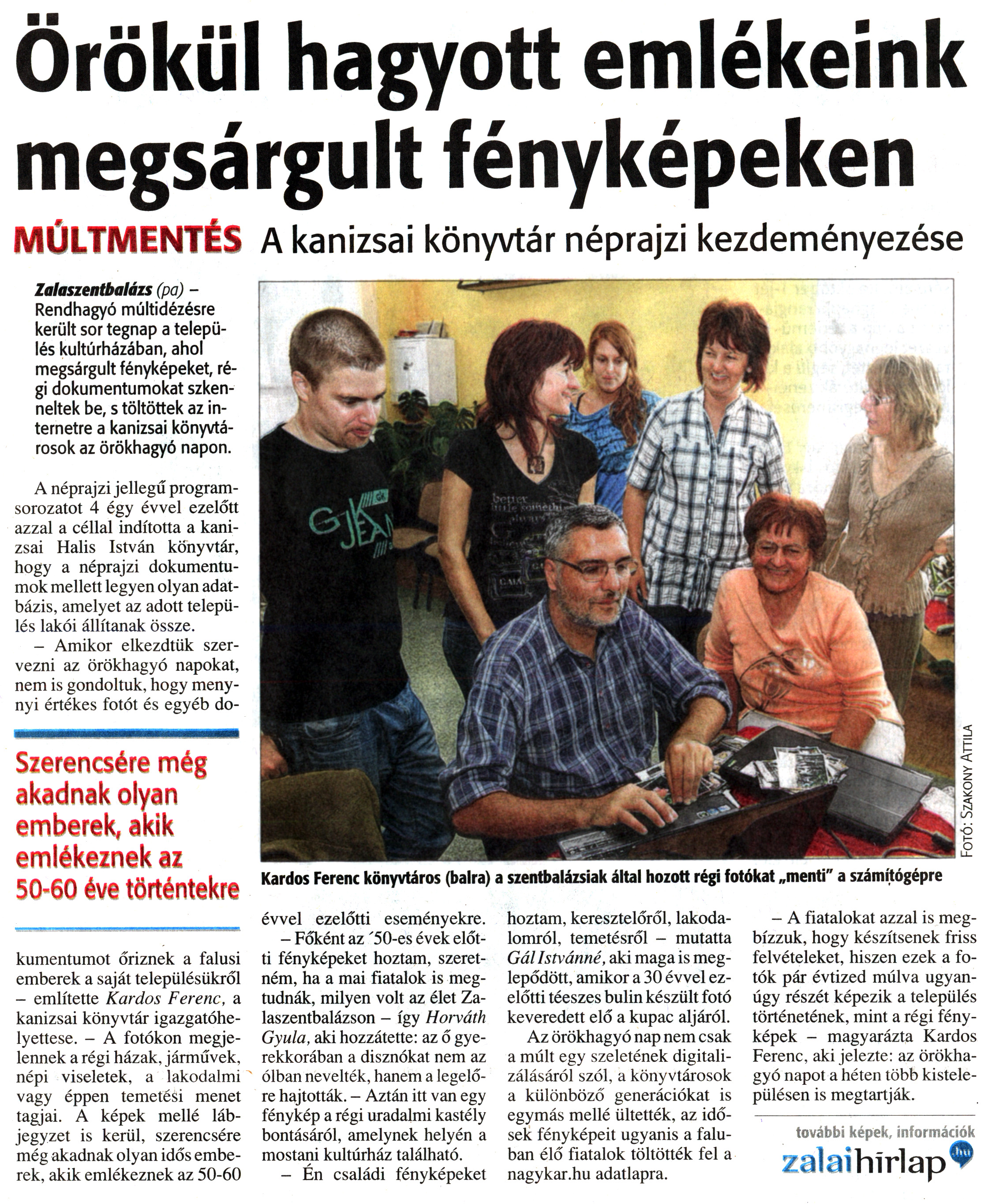 Nyilvános 1707 | 3993 | Zalai Hírlap 2012. október 2. 231. szám 4. oldal - Örökül hagyott emlékeink megsárgult fényképeken | Örökül hagyott emlékeink megsárgult fényképeken MÚLTMENTÉS A kanizsai könyvtár néprajzi kezdeményezése Kardos Ferenc könyvtáros (balra) a szentbalázsiak által hozott régi fotókat „menti" a számítógépre Zalaszentbalázs (pa) - Rendhagyó múltidézésre került sor tegnap a település kultúrházában, ahol megsárgult fényképeket, régi dokumentumokat szkenneltek be, s töltöttek az internetre a kanizsai könyvtárosok az örökhagyó napon. A néprajzi jellegű programsorozatot 4 égy évvel ezelőtt azzal a céllal indította a kanizsai Halis István könyvtár, hogy a néprajzi dokumentumok mellett legyen olyan adatbázis, amelyet az adott település lakói állítanak össze. - Amikor elkezdtük szervezni az örökhagyó napokat, nem is gondoltuk, hogy menynyi értékes fotót és egyéb dokumentumot őriznek a falusi emberek a saját településükről - említette Kardos Ferenc, a kanizsai könyvtár igazgatóhelyettese. - A fotókon megjelennek a régi házak, járművek, népi viseletek, a lakodalmi vagy éppen temetési menet tagjai. A képek mellé lábjegyzet is kerül, szerencsére még akadnak olyan idős emberek, akik emlékeznek az 50-60 évvel ezelőtti eseményekre. - Főként az \'50-es évek előtti fényképeket hoztam, szeretném, ha a mai fiatalok is megtudnák, milyen volt az élet Zalaszentbalázson - így Horváth Gyula, aki hozzátette: az ő gyerekkorában a disznókat nem az ólban nevelték, hanem a legelőre hajtották. - Aztán itt van egy fénykép a régi uradalmi kastély bontásáról, amelynek helyén a mostani kultúrház található. - Én családi fényképeket hoztam, keresztelőről, lakodalomról, temetésről - mutatta Gál Istvánné, aki maga is meglepődött, amikor a 30 évvel ezelőtti téeszes bulin készült fotó keveredett elő a kupac aljáról. Az örökhagyó nap nem csak a múlt egy szeletének digitalizálásáról szól, a könyvtárosok a különböző generációkat is egymás mellé ültették, az idősek fényképeit ugyanis a faluban élő fiatalok töltötték fel a nagykar.hu adatlapra. - A fiatalokat azzal is megbízzuk, hogy készítsenek friss felvételeket, hiszen ezek a fotók pár évtized múlva ugyanúgy részét képezik a település történetének, mint a régi fényképek - magyarázta Kardos Ferenc, aki jelezte: az örökhagyó napot a héten több kistelepülésen is megtartják. |