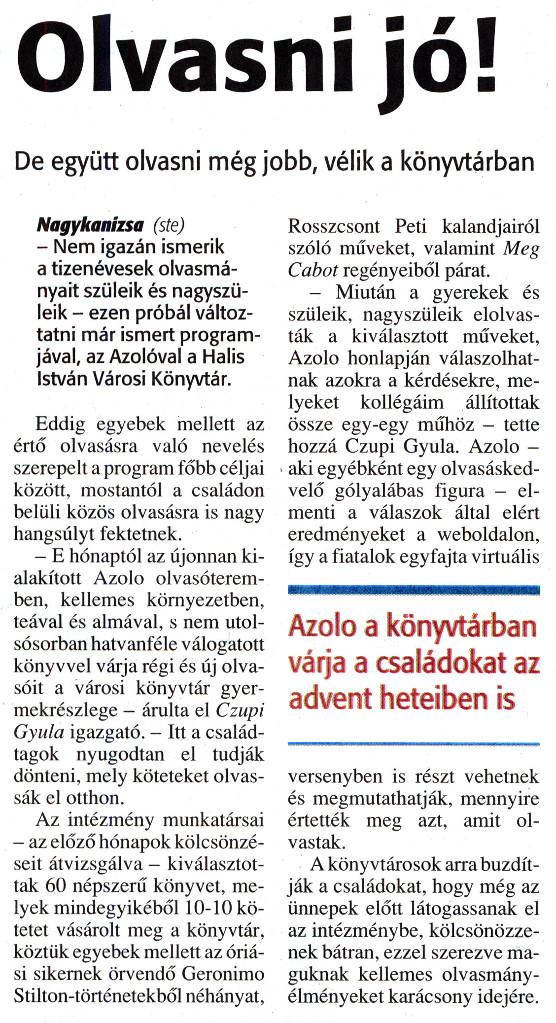 Nyilvános 1612 | 4328 | Zalai Hírlap 2012. december 6. 285. szám 11. oldal - Olvasni jó | Olvasni jó! De együtt olvasni még jobb, vélik a könyvtárban Azolo a könyvtárban várja a családokat az advent heteiben is Nagykanizsa (ste) - Nem igazán ismerik a tizenévesek olvasmányait szüleik és nagyszüleik - ezen próbál változtatni már ismert programjával, az Azolóval a Halis István Városi Könyvtár. Eddig egyebek mellett az értő olvasásra való nevelés szerepelt a program főbb céljai között, mostantól a családon belüli közös olvasásra is nagy hangsúlyt fektetnek. - E hónaptól az újonnan kialakított Azolo olvasóteremben, kellemes környezetben, teával és almával, s nem utolsósorban hatvanféle válogatott könyvvel várja régi és új olvasóit a városi könyvtár gyermekrészlege - árulta el Czupi Gyula igazgató. - Itt a családtagok nyugodtan el tudják dönteni, mely köteteket olvassák el otthon. Az intézmény munkatársai - az előző hónapok kölcsönzéseit átvizsgálva - kiválasztottak 60 népszerű könyvet, melyek mindegyikéből 10-10 kötetet vásárolt meg a könyvtár, köztük egyebek mellett az óriási sikernek örvendő Geronimo Stilton-történetekből néhányat, Rosszcsont Peti kalandjairól szóló műveket, valamint Meg Cabot regényeiből párat. - Miután a gyerekek és szüleik, nagyszüleik elolvasták a kiválasztott műveket, Azolo honlapján válaszolhatnak azokra a kérdésekre, melyeket kollégáim állítottak össze egy-egy műhöz - tette hozzá Czupi Gyula. Azolo -aki egyébként egy olvasáskedvelő gólyalábas figura - elmenti a válaszok által elért eredményeket a weboldalon, így a fiatalok egyfajta virtuális versenyben is részt vehetnek és megmutathatják, mennyire értették meg azt, amit olvastak. A könyvtárosok arra buzdítják a családokat, hogy még az ünnepek előtt látogassanak el az intézménybe, kölcsönözzenek bátran, ezzel szerezve maguknak kellemes olvasmányélményeket karácsony idejére. |