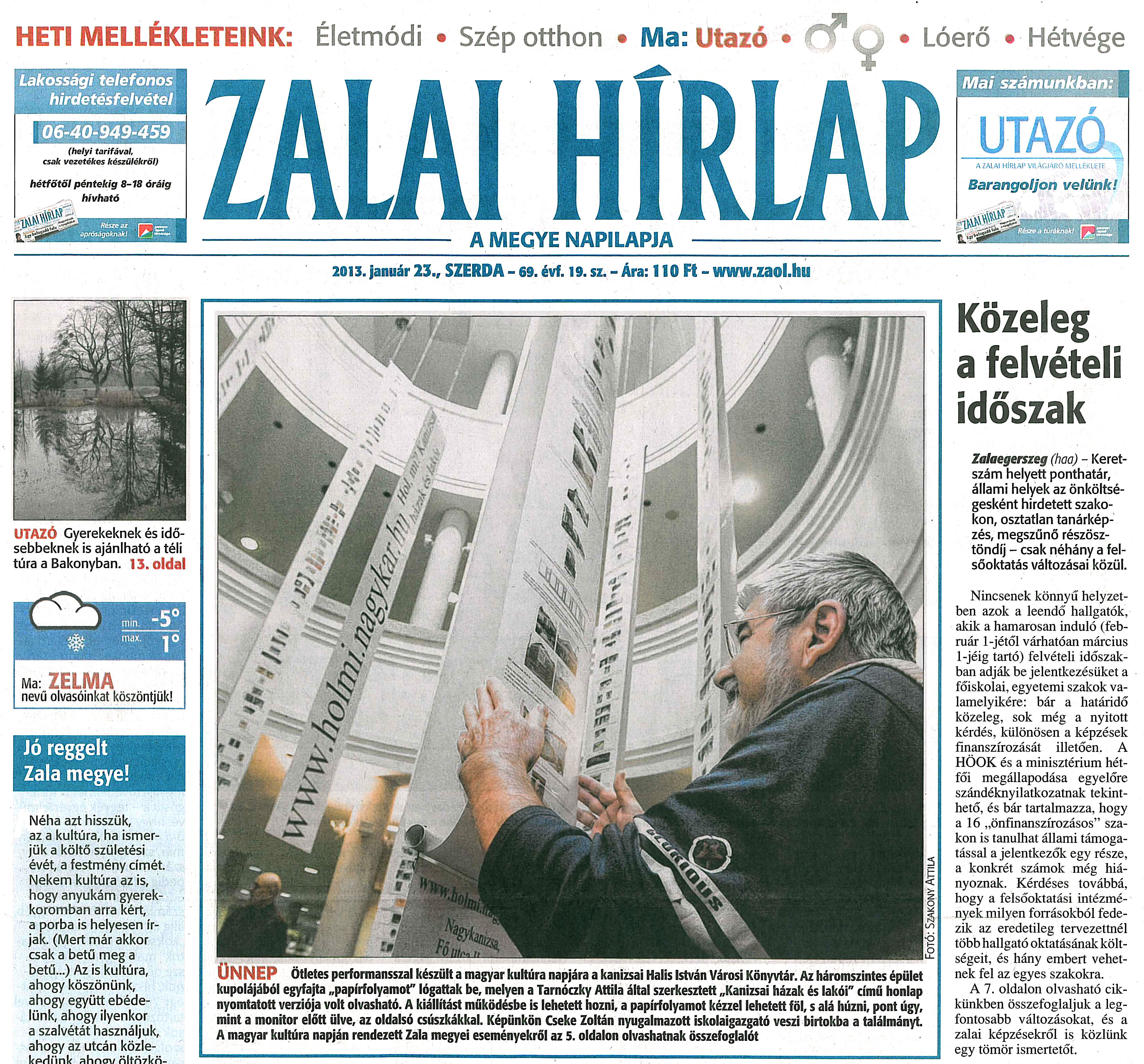Nyilvános 1753 | 5260 | Zalai Hírlap 2013. január 23. 19. szám 1. oldal - Ünnep | ÜNNEP Ötletes performansszal készült a magyar kultúra napjára a kanizsai Halis István Városi Könyvtár. Az háromszintes épület kupolájából egyfajta „papírfolyamot" lógattak be, melyen a Tarnóczky Attila által szerkesztett „Kanizsai házak és lakói" című honlap nyomtatott verziója volt olvasható. A kiállítást működésbe is lehetett hozni, a papírfolyamot kézzel lehetett föl, s alá húzni, pont úgy, mint a monitor előtt ülve, az oldalsó csúszkákkal. Képünkön Cseke Zoltán nyugalmazott iskolaigazgató veszi birtokba a találmányt. A magyar kultúra napján rendezett Zala megyei eseményekről az 5. oldalon olvashatnak összefoglalót Fotó: Szakony Attila |