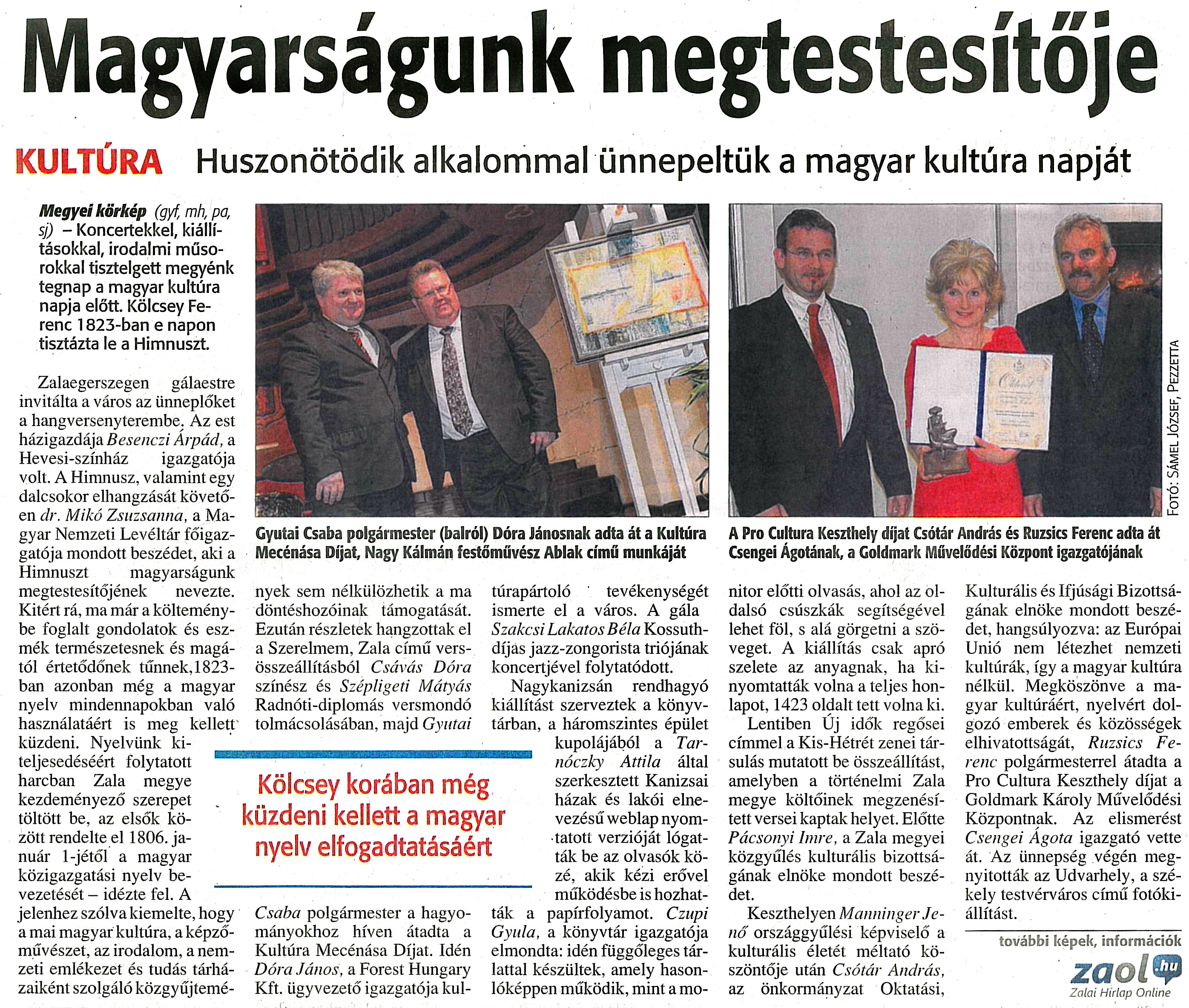 Nyilvános 1753 | 4404 | Zalai Hírlap 2013. január 23. 19. szám 5. oldal - Magyarságunk megtestesítője | Magyarságunk megtestesítője KULTÚRA Huszonötödik alkalommal ünnepeltük a magyar kultúra napját Kölcsey korában még küzdeni kellett a magyar nyelv elfogadtatásáért Megyei körkép (gyf, mh, pa, sj) - Koncertekkel, kiállításokkal, irodalmi műsorokkal tisztelgett megyénk tegnap a magyar kultúra napja előtt. Kölcsey Ferenc 1823-ban e napon tisztázta le a Himnuszt. Zalaegerszegen gálaestre invitálta a város az ünneplőket a hangversenyterembe. Az est házigazdája Besenczi Árpád, a Hevesi-színház igazgatója volt. A Himnusz, valamint egy dalcsokor elhangzását követően dr. Mikó Zsuzsanna, a Magyar Nemzeti Levéltár főigazgatója mondott beszédet, aki a Himnuszt magyarságunk megtestesítőjének nevezte. Kitért rá, ma már a költeménybe foglalt gondolatok és eszmék természetesnek és magától értetődőnek tűnnek, 1823-ban azonban még a magyar nyelv mindennapokban való használatáért is meg kellett küzdeni. Nyelvünk kiteljesedéséért folytatott harcban Zala megye kezdeményező szerepet töltött be. az elsők között rendelte el 1806. január l-jétől a magyar közigazgatási nyelv bevezetését - idézte fel. A jelenhez szólva kiemelte, hogy a mai magyar kultúra, a képzőművészet, az irodalom, a nemzeti emlékezet és tudás tárházaiként szolgáló közgyűjtemények sem nélkülözhetik a ma döntéshozóinak támogatását. Ezután részletek hangzottak el a Szerelmem, Zala című versösszeállításból Csávás Dóra színész és Szépligeti Mátyás Radnóti-diplomás versmondó tolmácsolásában, majd Gyutai Csaba polgármester a hagyományokhoz híven átadta a Kultúra Mecénása Díjat. Idén Dóra János, a Forest Hungary Kft. ügyvezető igazgatója kultúrapártoló tevékenységét ismerte el a város. A gála Szakcsi Lakatos Béla Kossuth-díjas jazz-zongorista triójának koncertjével folytatódott. Nagykanizsán rendhagyó kiállítást szerveztek a könyvtárban, a háromszintes épület kupolájából a Tarnóczky Attila által szerkesztett Kanizsai házak és lakói elnevezésű weblap nyomtatott verzióját lógatták be az olvasók közé, akik kézi erővel működésbe is hozhatták a papírfolyamot. Czupi Gyula, a könyvtár igazgatója elmondta: idén függőleges tárlattal készültek, amely hasonlóképpen működik, mint a monitor előtti olvasás, ahol az oldalsó csúszkák segítségével lehet föl, s alá görgetni a szöveget. A kiállítás csak apró szelete az anyagnak, ha kinyomtatták volna a teljes honlapot, 1423 oldalt tett volna ki. Lentiben Új idők regősei címmel a Kis-Hétrét zenei társulás mutatott be összeállítást, amelyben a történelmi Zala megye költőinek megzenésített versei kaptak helyet. Előtte Pácsonyi Imre, a Zala megyei közgyűlés kulturális bizottságának elnöke mondott beszédet. Keszthelyen Manninger Jenő országgyűlési képviselő a kulturális életét méltató köszöntője után Csótár András, az önkormányzat Oktatási, Kulturális és Ifjúsági Bizottságának elnöke mondott beszédet, hangsúlyozva: az Európai Unió nem létezhet nemzeti kultúrák, így a magyar kultúra nélkül. Megköszönve a magyar kultúráért, nyelvért dolgozó emberek és közösségek elhivatottságát, Ruzsics Ferenc polgármesterrel átadta a Pro Cultura Keszthely díjat a Goldmark Károly Művelődési Központnak. Az elismerést Csengei Ágota igazgató vette át. Az ünnepség végén megnyitották az Udvarhely, a székely testvérváros című fotókiállítást. további képek, információk zaol.hu Zalai Hírlap Online Gyutai Csaba polgármester (balról) Dóra Jánosnak adta át a Kultúra Mecénása Díjat, Nagy Kálmán festőművész Ablak című munkáját A Pro Cultura Keszthely díjat Csótár András és Ruzsics Ferenc adta át Csengei Ágotának, a Goldmark Művelődési Központ igazgatójának Fotó: Sámel József, Pezzetta |