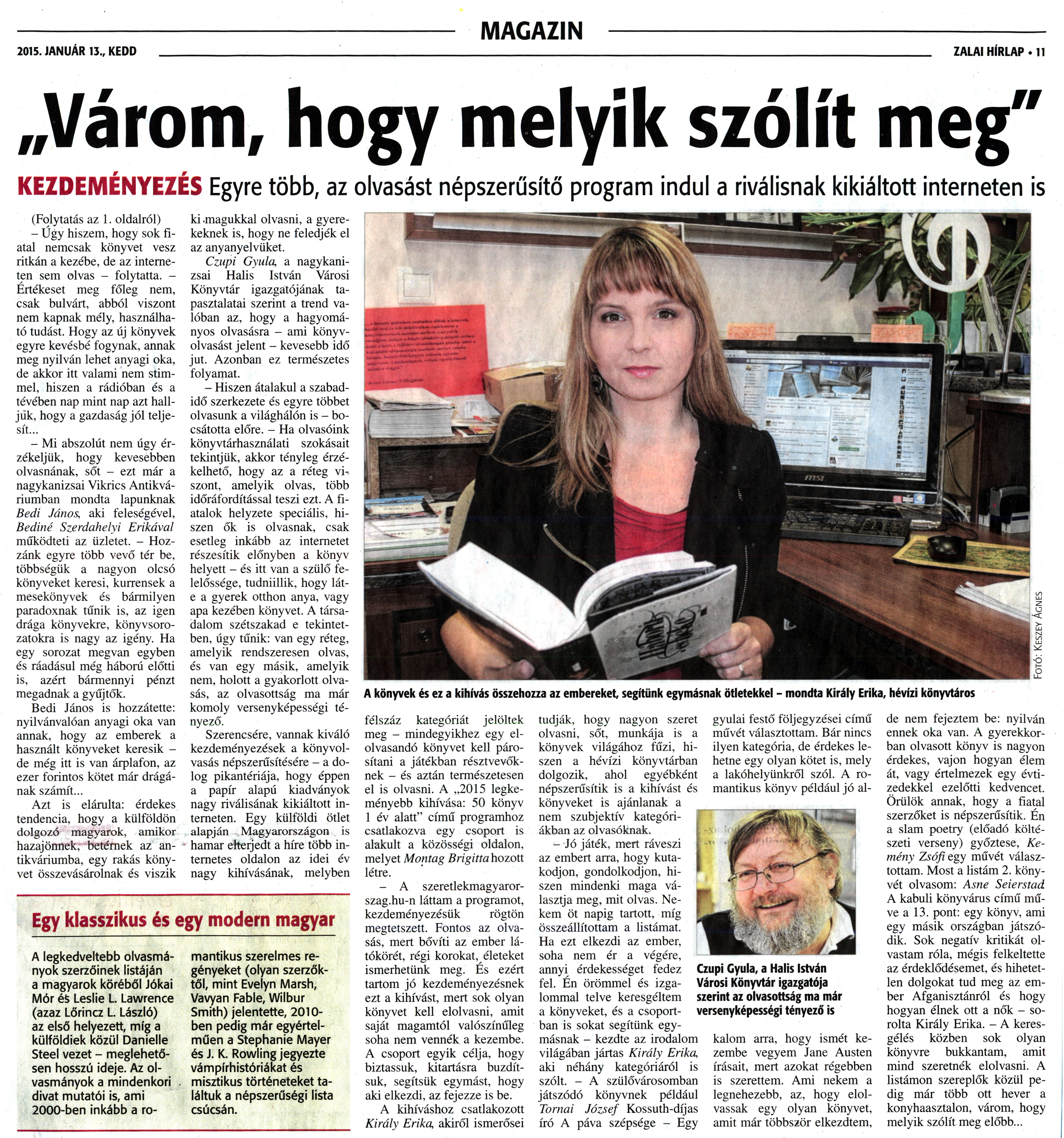 Nyilvános 1635 | 3951 | Zalai Hírlap 2015. január 13. 10. szám 11. oldal | 2015. JANUÁR 13., KEDD MAGAZIN ZALAI HÍRLAP • 11 „Várom, hogy melyik szólít meg" KEZDEMÉNYEZÉS Egyre több, az olvasást népszerűsítő program indul a riválisnak kikiáltott interneten is Egy klasszikus és egy modern magyar A legkedveltebb olvasmányok szerzőinek listáján a magyarok köréből Jókai Mór és Leslie L. Lawrence (azaz Lőrincz L. László) az első helyezett, míg a külföldiek közül Danielle Steel vezet - meglehetősen hosszú ideje. Az olvasmányok a mindenkori divat mutatói is, ami 2000-ben inkább a ro- mantikus szerelmes regényeket (olyan szerzőktől, mint Evelyn Marsh, Vavyan Fable, Wilbur Smith) jelentette, 2010-ben pedig már egyértelműen a Stephanie Mayer és J. K. Rowling jegyezte vámpírhistóriákat és misztikus történeteket találtuk a népszerűségi lista csúcsán. (Folytatás az 1. oldalról) - Úgy hiszem, hogy sok fiatal nemcsak könyvet vesz ritkán a kezébe, de az interneten sem olvas - folytatta. -Értékeset meg főleg nem, csak bulvárt, abból viszont nem kapnak mély, használható tudást. Hogy az új könyvek egyre kevésbé fogynak, annak meg nyilván lehet anyagi oka, de akkor itt valami nem stimmel, hiszen a rádióban és a tévében nap mint nap azt halljuk, hogy a gazdaság jól teljesít... - Mi abszolút nem úgy érzékeljük, hogy kevesebben olvasnának, sőt - ezt már a nagykanizsai Vikrics Antikváriumban mondta lapunknak Bedi János, aki feleségével, Bediné Szerdahelyi Erikával működteti az üzletet. - Hozzánk egyre több vevő tér be, többségük a nagyon olcsó könyveket keresi, kurrensek a mesekönyvek és bármilyen paradoxnak tűnik is, az igen drága könyvekre, könyvsorozatokra is nagy az igény. Ha egy sorozat megvan egyben és ráadásul még háború előtti is, azért bármennyi pénzt megadnak a gyűjtők. Bedi János is hozzátette: nyilvánvalóan anyagi oka van annak, hogy az emberek a használt könyveket keresik -de még itt is van árplafon, az ezer forintos kötet már drágának számít... Azt is elárulta: érdekes tendencia, hogy a külföldön dolgozó magyarok, amikor hazajönnek, betérnek az antikváriumba, egy rakás könyvet összevásárolnak és viszik ki magukkal olvasni, a gyerekeknek is, hogy ne feledjék el az anyanyelvüket. Czupi Gyula, a nagykanizsai Halis István Városi Könyvtár igazgátójának tapasztalatai szerint a trend valóban az, hogy a hagyományos olvasásra - ami könyvolvasást jelent - kevesebb idő jut. Azonban ez természetes folyamat. - Hiszen átalakul a szabadidő szerkezete és egyre többet olvasunk a világhálón is - bocsátotta előre. - Ha olvasóink könyvtárhasználati szokásait tekintjük, akkor tényleg érzékelhető, hogy az a réteg viszont, amelyik olvas, több időráfordítással teszi ezt. A fiatalok helyzete speciális, hiszen ők is olvasnak, csak esetleg inkább az internetet részesítik előnyben a könyv helyett - és itt van a szülő felelőssége, tudniillik, hogy lát-e a gyerek otthon anya, vagy apa kezében könyvet. A társadalom szétszakad e tekintetben, úgy tűnik: van egy réteg, amelyik rendszeresen olvas, és van egy másik, amelyik nem, holott a gyakorlott olvasás, az olvasottság ma már komoly versenyképességi tényező. Szerencsére, vannak kiváló kezdeményezések a könyvolvasás népszerűsítésére - a dolog pikantériája, hogy éppen a papír alapú kiadványok nagy riválisának kikiáltott interneten. Egy külföldi ötlet alapján Magyarországon is hamar elterjedt a híre több internetes oldalon az idei év nagy kihívásának, melyben félszáz kategóriát jelöltek meg - mindegyikhez egy elolvasandó könyvet kell párosítani a játékban résztvevőknek - és aztán természetesen el is olvasni. A „2015 legkeményebb kihívása: 50 könyv 1 év alatt" című programhoz csatlakozva egy csoport is alakult a közösségi oldalon, melyet Montag Brigitta hozott létre. - A szeretlekmagyarorszag.hu-n láttam a programot, kezdeményezésük rögtön megtetszett. Fontos az olvasás, mert bővíti az ember látókörét, régi korokat, életeket ismerhetünk meg. És ezért tartom jó kezdeményezésnek ezt a kihívást, mert sok olyan könyvet kell elolvasni, amit saját magamtól valószínűleg soha nem vennék a kezembe. A csoport egyik célja, hogy biztassuk, kitartásra buzdítsuk, segítsük egymást, hogy aki elkezdi, az fejezze is be. A kihíváshoz csatlakozott Király Erika, akiről ismerősei tudják, hogy nagyon szeret olvasni, sőt, munkája is a könyvek világához fűzi, hiszen a hévízi könyvtárban dolgozik, ahol egyébként népszerűsítik is a kihívást és könyveket is ajánlanak a nem szubjektív kategóriákban az olvasóknak. - Jó játék, mert ráveszi az embert arra, hogy kutakodjon, gondolkodjon, hiszen mindenki maga választja meg, mit olvas. Nekem öt napig tartott, míg összeállítottam a listámat. Ha ezt elkezdi az ember, soha nem ér a végére, annyi érdekességet fedez fel. Én örömmel és izgalommal telve keresgéltem a könyveket, és a csoportban is sokat segítünk egymásnak - kezdte az irodalom világában jártas Király Erika, aki néhány kategóriáról is szólt. - A szülővárosomban játszódó könyvnek például Tornai József Kossuth-díjas író A páva szépsége - Egy gyulai festő följegyzései című művét választottam. Bár nincs ilyen kategória, de érdekes lehetne egy olyan kötet is, mely a lakóhelyünkről szól. A romantikus könyv például jó al- kalom arra, hogy ismét kezembe vegyem Jane Austen írásait, mert azokat régebben is szerettem. Ami nekem a legnehezebb, az, hogy elolvassak egy olyan könyvet, amit már többször elkezdtem, de nem fejeztem be: nyilván ennek oka van. A gyerekkorban olvasott könyv is nagyon érdekes, vajon hogyan élem át, vagy értelmezek egy évtizedekkel ezelőtti kedvencet. Ö