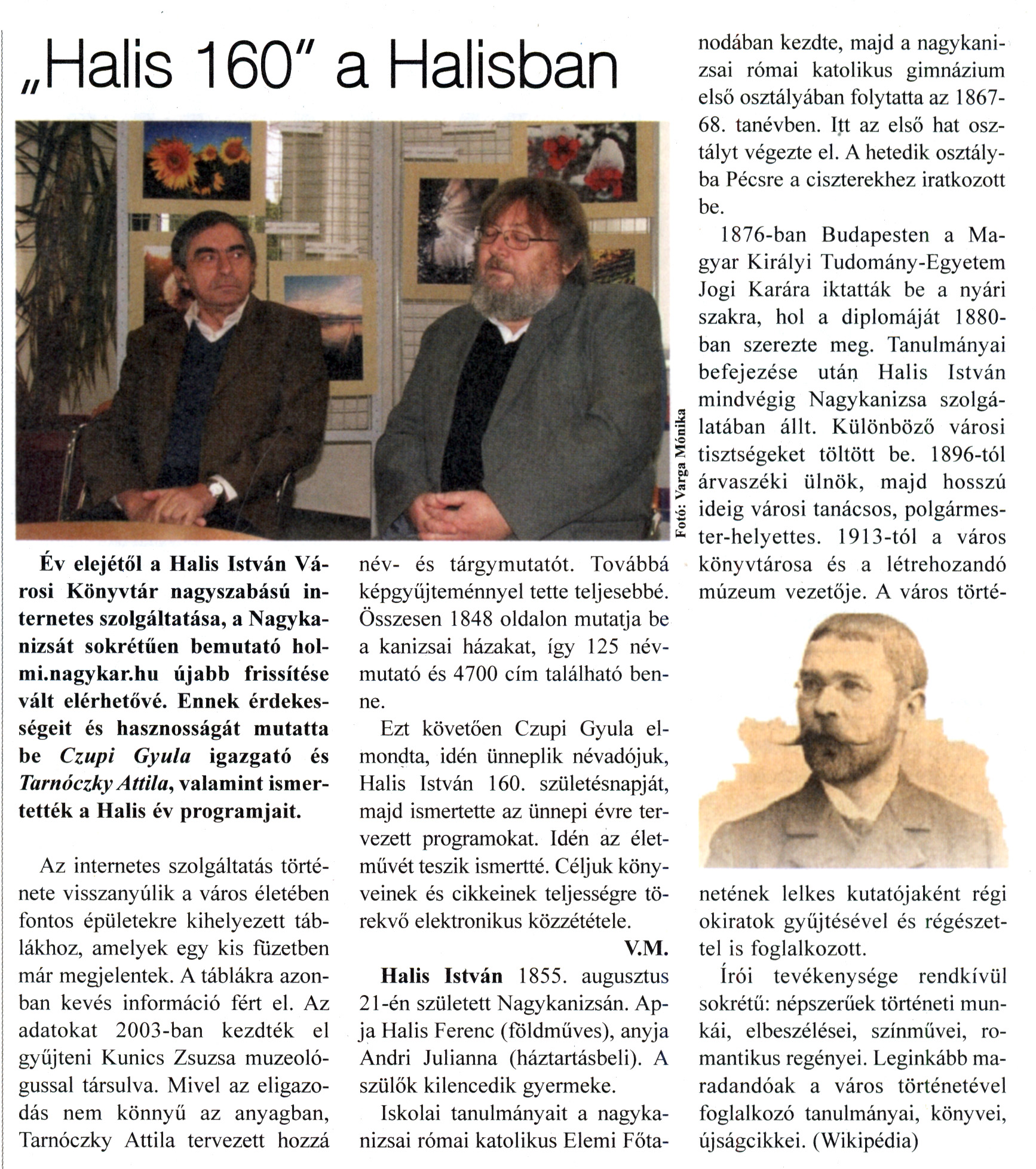 Nyilvános 2110 | 5548 | Kanizsa 2015. január 15. 1. szám 2. oldal | „Halis 160" a Halisban Év elejétől a Halis István Városi Könyvtár nagyszabású internetes szolgáltatása, a Nagykanizsát sokrétűen bemutató hol-mi.nagykar.hu újabb frissítése vált elérhetővé. Ennek érdekességeit és hasznosságát mutatta be Czupi Gyula igazgató és TarnóczkyAttila, valamint ismertették a Halis év programjait. Az internetes szolgáltatás története visszanyúlik a város életében fontos épületekre kihelyezett táblákhoz, amelyek egy kis füzetben már megjelentek. A táblákra azonban kevés információ fért el. Az adatokat 2003-ban kezdték el gyűjteni Kunics Zsuzsa muzeológussal társulva. Mivel az eligazodás nem könnyű az anyagban, Tarnóczky Attila tervezett hozzá név- és tárgymutatót. Továbbá képgyűjteménnyel tette teljesebbé. Összesen 1848 oldalon mutatja be a kanizsai házakat, így 125 névmutató és 4700 cím található benne. Ezt követően Czupi Gyula elmondta, idén ünneplik névadójuk, Halis István 160. születésnapját, majd ismertette az ünnepi évre tervezett programokat. Idén az életművét teszik ismertté. Céljuk könyveinek és cikkeinek teljességre törekvő elektronikus közzététele. V.M. Halis István 1855. augusztus 21-én született Nagykanizsán. Apja Halis Ferenc (földműves), anyja Andri Julianna (háztartásbeli). A szülők kilencedik gyermeke. Iskolai tanulmányait a nagykanizsai római katolikus Elemi Főtanodában kezdte, majd a nagykanizsai római katolikus gimnázium első osztályában folytatta az 1867-68. tanévben. Itt az első hat osztályt végezte el. A hetedik osztályba Pécsre a ciszterekhez iratkozott be. 1876-ban Budapesten a Magyar Királyi Tudomány-Egyetem Jogi Karára iktatták be a nyári szakra, hol a diplomáját 1880-ban szerezte meg. Tanulmányai befejezése után Halis István mindvégig Nagykanizsa szolgálatában állt. Különböző városi tisztségeket töltött be. 1896-tól árvaszéki ülnök, majd hosszú ideig városi tanácsos, polgármester-helyettes. 1913-tól a város könyvtárosa és a létrehozandó múzeum vezetője. A város történetének lelkes kutatójaként régi okiratok gyűjtésével és régészettel is foglalkozott. írói tevékenysége rendkívül sokrétű: népszerűek történeti munkái, elbeszélései, színművei, romantikus regényei. Leginkább maradandóak a város történetével foglalkozó tanulmányai, könyvei, újságcikkei. (Wikipédia) |
