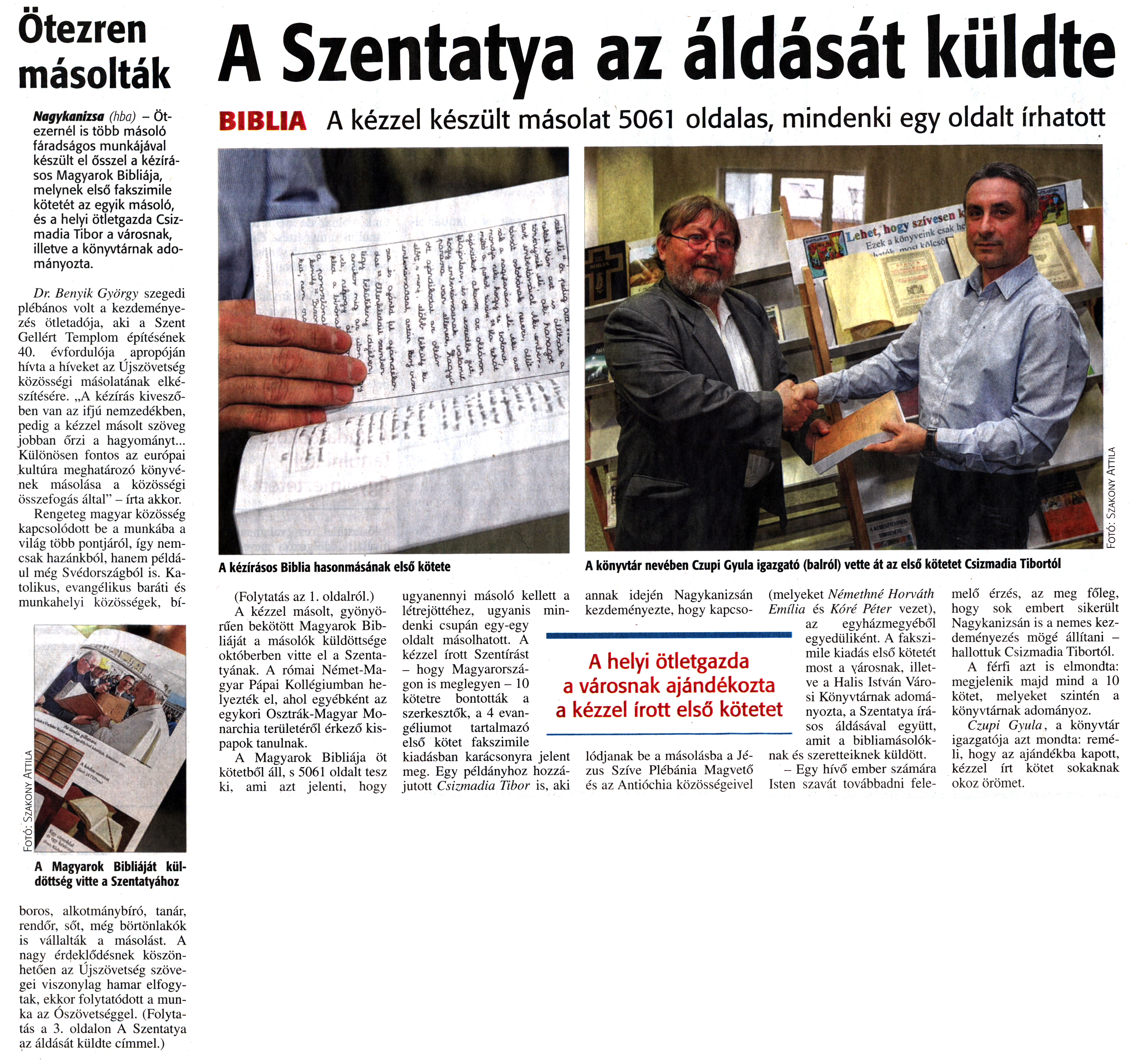 Nyilvános 1696 | 3529 | Zalai Hírlap 2016. január 6. 4. szám 1, 3. oldal - Ötezren másolták - A Szentatya az áldását küldte | Ötezren másolták Nagykanizsa (hba) - Ötezernél is több másoló fáradságos munkájával készült el ősszel a kézírásos Magyarok Bibliája, melynek első fakszimile kötetét az egyik másoló, és a helyi ötletgazda Csizmadia Tibor a városnak, illetve a könyvtárnak adományozta. Dr. Benyik György szegedi plébános volt a kezdeményezés ötletadója, aki a Szent Gellért Templom építésének 40. évfordulója apropóján hívta a híveket az Újszövetség közösségi másolatának elkészítésére. „A kézírás kiveszőben van az ifjú nemzedékben, pedig a kézzel másolt szöveg jobban őrzi a hagyományt... Különösen fontos az európai kultúra meghatározó könyvének másolása a közösségi összefogás által" - írta akkor. Rengeteg magyar közösség kapcsolódott be a munkába a világ több pontjáról, így nemcsak hazánkból, hanem például még Svédországból is. Katolikus, evangélikus baráti és munkahelyi közösségek, bíboros, alkotmánybíró, tanár, rendőr, sőt, még börtönlakók is vállalták a másolást. A nagy érdeklődésnek köszönhetően az Újszövetség szövegei viszonylag hamar elfogytak, ekkor folytatódott a munka az Ószövetséggel. (Folytatás a 3. oldalon A Szentatya az áldását küldte címmel.) A Szentatya az áldását küldte BIBLIA A kézzel készült másolat 5061 oldalas, mindenki egy oldalt írhatott A kézírásos Biblia hasonmásának első kötete A könyvtár nevében Czupi Gyula igazgató (balról) vette át az első kötetet Csizmadia Tibortól (Folytatás az 1. oldalról.) A kézzel másolt, gyönyörűen bekötött Magyarok Bibliáját a másolók küldöttsége októberben vitte el a Szentatyának. A római Német-Magyar Pápai Kollégiumban helyezték el, ahol egyébként az egykori Osztrák-Magyar Monarchia területéről érkező kispapok tanulnak. A Magyarok Bibliája öt kötetből áll, s 5061 oldalt tesz ki, ami azt jelenti, hogy ugyanennyi másoló kellett a létrejöttéhez, ugyanis mindenki csupán egy-egy oldalt másolhatott. A kézzel írott Szentírást - hogy Magyarországon is meglegyen - 10 kötetre bontották a szerkesztők, a 4 evangéliumot tartalmazó első kötet fakszimile kiadásban karácsonyra jelent meg. Egy példányhoz hozzájutott Csizmadia Tibor is, aki annak idején Nagykanizsán kezdeményezte, hogy kapcsolódjanak be a másolásba a Jézus Szíve Plébánia Magvető és az Antióchia közösségeivel (melyeket Némethné Horváth Emília és Kóré Péter vezet), az egyházmegyéből egyedüliként. A fakszimile kiadás első kötetét most a városnak, illetve a Halis István Városi Könyvtárnak adományozta, a Szentatya írásos áldásával együtt, amit a bibliamásolóknak és szeretteiknek küldött. - Egy hívő ember számára Isten szavát továbbadni felemelő érzés, az meg főleg, hogy sok embert sikerült Nagykanizsán is a nemes kezdeményezés mögé állítani - hallottuk Csizmadia Tibortól. A férfi azt is elmondta: megjelenik majd mind a 10 kötet, melyeket szintén a könyvtárnak adományoz. Czupi Gyula, a könyvtár igazgatója azt mondta: reméli, hogy az ajándékba kapott, kézzel írt kötet sokaknak okoz örömet. |