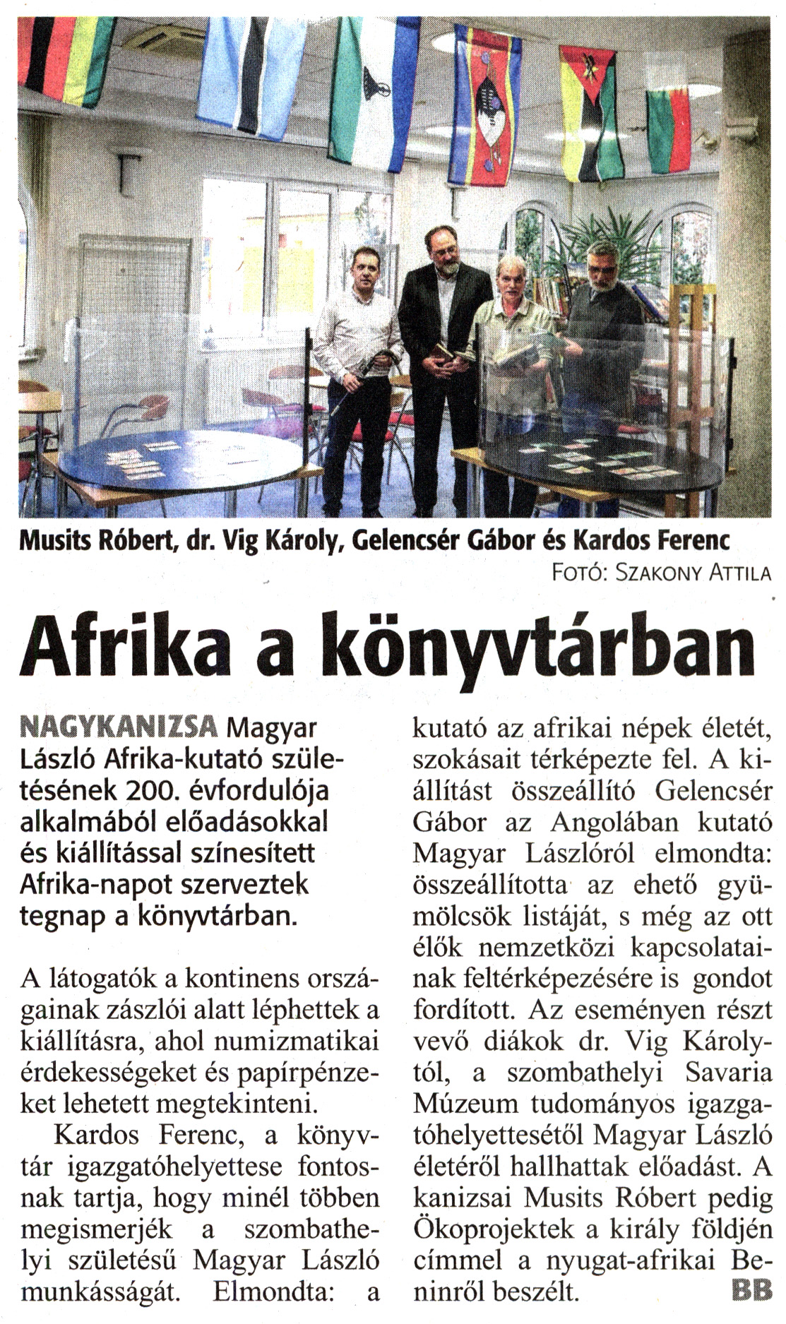 Nyilvános 1494 | 2535 | Zalai Hírlap 2018. november 14. 264. szám 4. oldal - Afrika a könyvtárban | Musits Róbert, dr. Vig Károly, Gelencsér Gábor és Kardos Ferenc Fotó: Szakony Attila Afrika a könyvtárban NAGYKANIZSA Magyar László Afrika-kutató születésének 200. évfordulója alkalmából előadásokkal és kiállítással színesített Afrika-napot szerveztek tegnap a könyvtárban. A látogatók a kontinens országainak zászlói alatt léphettek a kiállításra, ahol numizmatikai érdekességeket és papírpénzeket lehetett megtekinteni. Kardos Ferenc, a könyvtár igazgatóhelyettese fontosnak tartja, hogy minél többen megismerjék a szombathelyi születésű Magyar László munkásságát. Elmondta: a kutató az afrikai népek életét, szokásait térképezte fel. A kiállítást összeállító Gelencsér Gábor az Angolában kutató Magyar Lászlóról elmondta: összeállította az ehető gyümölcsök listáját, s még az ott élők nemzetközi kapcsolatainak feltérképezésére is gondot fordított. Az eseményen részt vevő diákok dr. Vig Károlytól, a szombathelyi Savaria Múzeum tudományos igazgatóhelyettesétől Magyar László életéről hallhattak előadást. A kanizsai Musits Róbert pedig Ökoprojektek a király földjén címmel a nyugat-afrikai Beninről beszélt. BB |