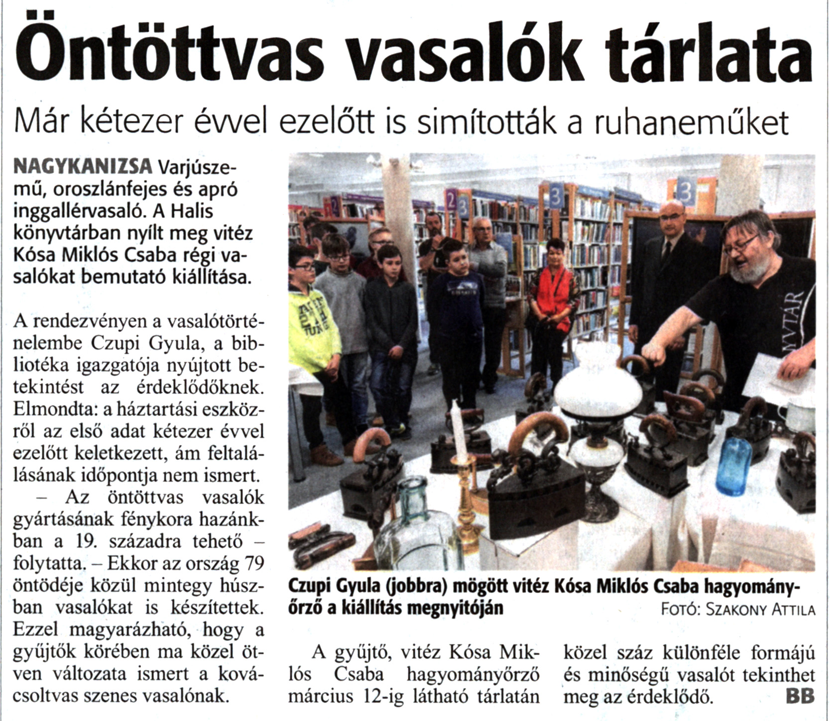 Nyilvános 1721 | 2830 | Zalai Hírlap 2019. február 14. 38. szám 16. oldal | Öntöttvas vasalók tárlata Már kétezer évvel ezelőtt is simították a ruhaneműket NAGYKANIZSA Varjúszemű, oroszlánfejes és apró inggallérvasaló. A Halis könyvtárban nyílt meg vitéz Kósa Miklós Csaba régi vasalókat bemutató kiállítása. A rendezvényen a vasalótörténelembe Czupi Gyula, a bibliotéka igazgatója nyújtott betekintést az érdeklődőknek. Elmondta: a háztartási eszközről az első adat kétezer évvel ezelőtt keletkezett, ám feltalálásának időpontja nem ismert. - Az öntöttvas vasalók gyártásának fénykora hazánkban a 19. századra tehető -folytatta. - Ekkor az ország 79 öntödéje közül mintegy húszban vasalókat is készítettek. Ezzel magyarázható, hogy a gyűjtők körében ma közel ötven változata ismert a kovácsoltvas szenes vasalónak. A gyűjtő, vitéz Kósa Miklós Csaba hagyományőrző március 12-ig látható tárlatán közel száz különféle formájú és minőségű vasalót tekinthet meg az érdeklődő. BB Czupi Gyula (jobbra) mögött vitéz Kósa Miklós Csaba hagyományőrző a kiállítás megnyitóján Fotó: Szakony Attila |