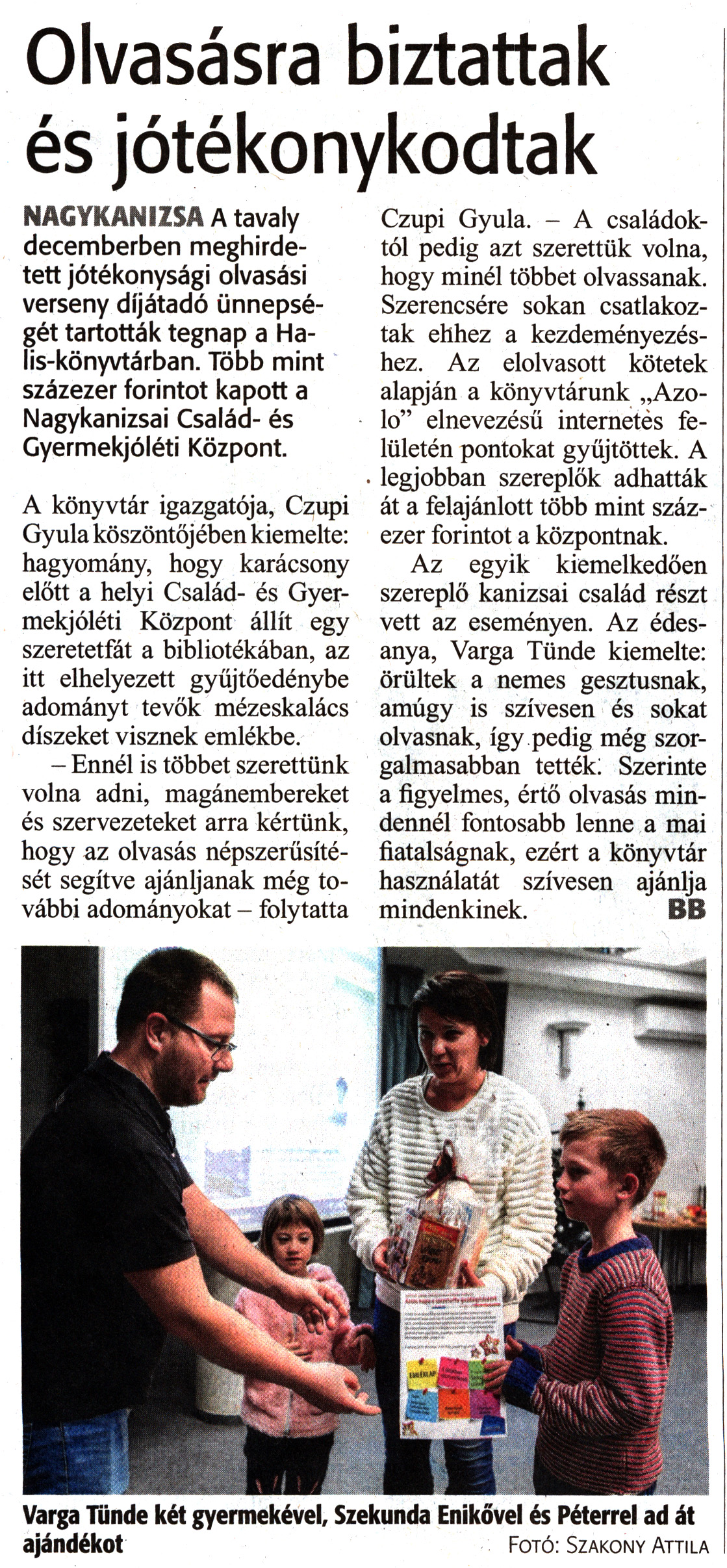 Nyilvános 1491 | 2596 | Zalai Hírlap 2020. január 7. 5. szám 4. oldal | Olvasásra biztattak és jótékonykodtak NAGYKANIZSA A tavaly decemberben meghirdetett jótékonysági olvasási verseny díjátadó ünnepségét tartották tegnap a Halis-könyvtárban. Több mint százezer forintot kapott a Nagykanizsai Család- és Gyermekjóléti Központ. A könyvtár igazgatója, Czupi Gyula köszöntőjében kiemelte: hagyomány, hogy karácsony előtt a helyi Család- és Gyermekjóléti Központ állít egy szeretetfát a bibliotékában, az itt elhelyezett gyűjtőedénybe adományt tevők mézeskalács díszeket visznek emlékbe. - Ennél is többet szerettünk volna adni, magánembereket és szervezeteket arra kértünk, hogy az olvasás népszerűsítését segítve ajánljanak még további adományokat - folytatta Czupi Gyula. - A családoktól pedig azt szerettük volna, hogy minél többet olvassanak. Szerencsére sokan csatlakoztak ehhez a kezdeményezéshez. Az elolvasott kötetek alapján a könyvtárunk „Azolo" elnevezésű internetes felületén pontokat gyűjtöttek. A legjobban szereplők adhatták át a felajánlott több mint százezer forintot a központnak. Az egyik kiemelkedően szereplő kanizsai család részt vett az eseményen. Az édesanya, Varga Tünde kiemelte: örültek a nemes gesztusnak, amúgy is szívesen és sokat olvasnak, így pedig még szorgalmasabban tették: Szerinte a figyelmes, értő olvasás mindennél fontosabb lenne a mai fiatalságnak, ezért a könyvtár használatát szívesen ajánlja mindenkinek. BB Varga Tünde két gyermekével, Szekunda Enikővel és Péterrel ad át ajándékot Fotó: Szakony Attila |