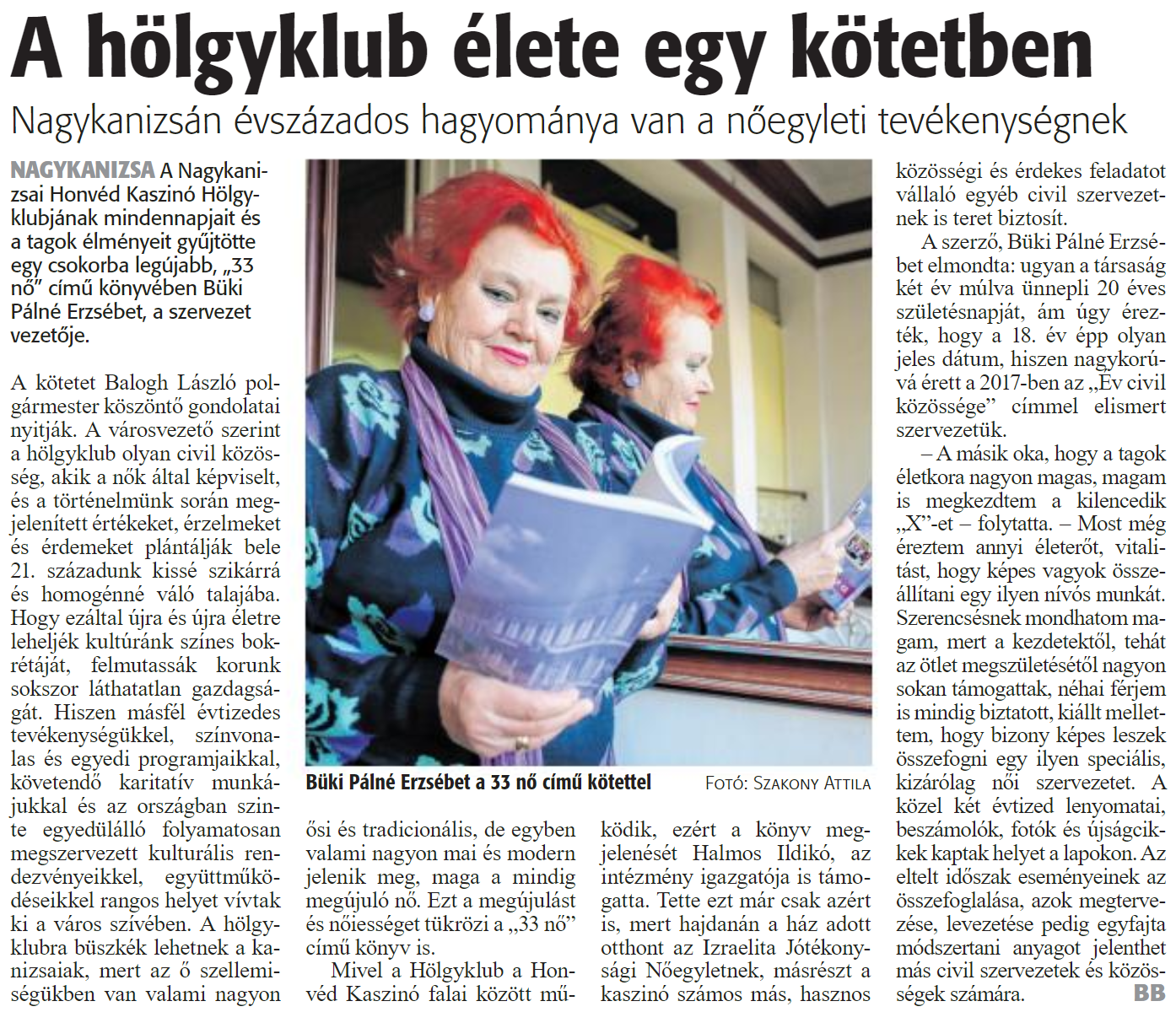 Nyilvános 1213 | 1608 | Zalai Hírlap 2020. május 6. 105. szám 13. oldal | A hölgyklub élete egy kötetben Nagykanizsán évszázados hagyománya van a nőegyleti tevékenységnek Büki Pálné Erzsébet a 33 nő című kötettel Fotó: Szakony Attila NAGYKANIZSA A Nagykanizsai Honvéd Kaszinó Hölgyklubjának mindennapjait és a tagok élményeit gyűjtötte egy csokorba legújabb, „33 nő" című könyvében Büki Pálné Erzsébet, a szervezet vezetője. A kötetet Balogh László polgármester köszöntő gondolatai nyitják. A városvezető szerint a hölgyklub olyan civil közösség, akik a nők által képviselt, és a történelmünk során megjelenített értékeket, érzelmeket és érdemeket plántálják bele 21. századunk kissé szikárrá és homogénné váló talajába. Hogy ezáltal újra és újra életre leheljék kultúránk színes bokrétáját, felmutassák korunk sokszor láthatatlan gazdagságát. Hiszen másfél évtizedes tevékenységükkel, színvonalas és egyedi programjaikkal, követendő karitatív munkájukkal és az országban szinte egyedülálló folyamatosan megszervezett kulturális rendezvényeikkel együttműködéseikkel rangos helyet vívtak ki a város szívében. A hölgyklubra büszkék lehetnek a kanizsaiak, mert az ő szellemiségükben van valami nagyon ősi és tradicionális, de egyben valami nagyon mai és modern jelenik meg, maga a mindig megújuló nő. Ezt a megújulást és nőiességet tükrözi a „33 nő" című könyv is. Mivel a Hölgyklub a Honvéd Kaszinó falai között működik, ezért a könyv megjelenését Halmos Ildikó, az intézmény igazgatója is támogatta. Tette ezt már csak azért is, mert hajdanán a ház adott otthont az Izraelita Jótékonysági Nőegyletnek, másrészt a kaszinó számos más, hasznos közösségi és érdekes feladatot vállaló egyéb civil szervezetnek is teret biztosít. A szerző. Büki Pálné Erzsébet elmondta: ugyan a társaság két év múlva ünnepli 20 éves születésnapját, ám úgy érezték, hogy a 18. év épp olyan jeles dátum, hiszen nagykorúvá érett a 2017-ben az „Év civil közössége" címmel elismert szervezetük. - A másik oka. hogy a tagok életkora nagyon magas, magam is megkezdtem a kilencedik „X"-et - folytatta. - Most még éreztem annyi életerőt, vitalitást, hogy képes vagyok összeállítani egy ilyen nívós munkát. Szerencsésnek mondhatom magam, mert a kezdetektől, tehát az ötlet megszületésétől nagyon sokan támogattak, néhai férjem is mindig biztatott, kiállt mellettem, hogy bizony képes leszek összefogni egy ilyen speciális, kizárólag női szervezetet. A közel két évtized lenyomatai, beszámolók, fotók és újságcikkek kaptak helyet a lapokon. Az eltelt időszak eseményeinek az összefoglalása, azok megtervezése, levezetése pedig egyfajta módszertani anyagot jelenthet más civil szervezetek és közösségek számára. BB |