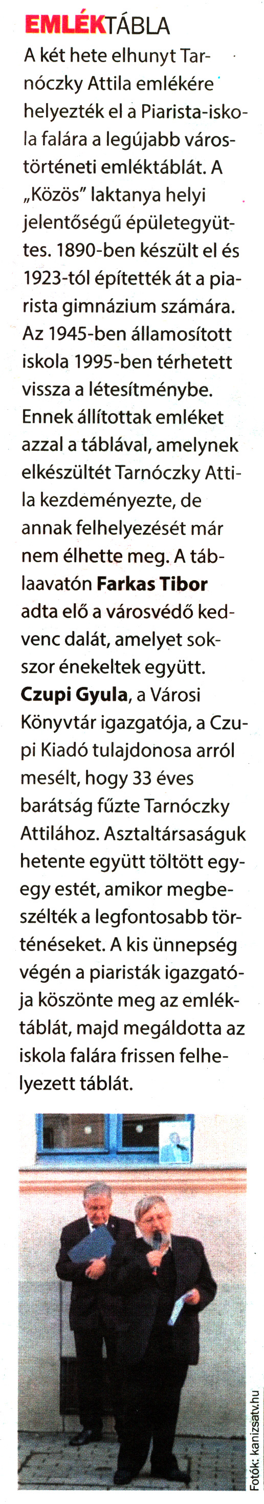 Nyilvános 1268 | 1844 | Kanizsa 2020. október 24. 38. szám 3. oldal | EMLÉKTÁBLA A két hete elhunyt Tarnóczky Attila emlékére helyezték el a Piarista-iskola falára a legújabb várostörténeti emléktáblát. A „Közös" laktanya helyi jelentőségű épületegyüttes. 1890-ben készült el és 1923-tól építették át a piarista gimnázium számára. Az 1945-ben államosított iskola 1995-ben térhetett vissza a létesítménybe. Ennek állítottak emléket azzal a táblával, amelynek elkészültét Tarnóczky Attila kezdeményezte, de annak felhelyezését már nem élhette meg. A táb-laavatón Farkas Tibor adta elő a városvédő kedvenc dalát, amelyet sokszor énekeltek együtt. Czupi Gyula, a Városi Könyvtár igazgatója, a Czupi Kiadó tulajdonosa arról mesélt, hogy 33 éves barátság fűzte Tarnóczky Attilához. Asztaltársaságuk hetente együtt töltött egy-egy estét, amikor megbeszélték a legfontosabb történéseket. A kis ünnepség végén a piaristák igazgatója köszönte meg az emléktáblát, majd megáldotta az iskola falára frissen felhelyezett táblát. |