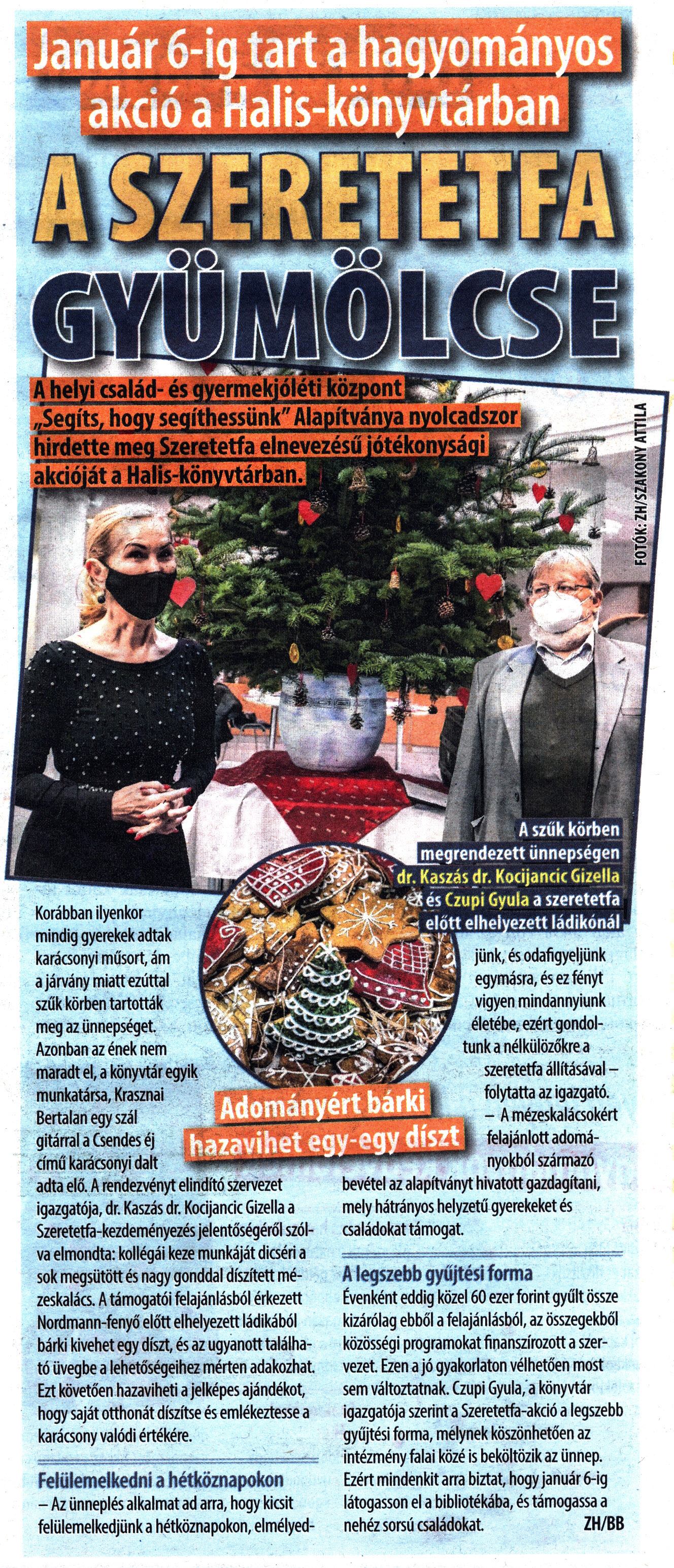Nyilvános 1634 | 3113 | City7 2021. december 17. 39. szám 7. oldal | A szeretetfa gyümölcse Január 6-ig tart a hagyományos akció a Halis-könyvtárban A helyi család- és gyermekjóléti központ „Segíts, hogy segíthessünk" Alapítványa nyolcadszor hirdette meg Szeretetfa elnevezésű jótékonysági akcióját a Halis-könvvtárban. Korábban ilyenkor mindig gyerekek adtak karácsonyi műsort, ám a járvány miatt ezúttal szűk körben tartották meg az ünnepséget. Azonban az ének nem maradt el, a könyvtár egyik munkatársa, Krasznai Bertalan egy szál gitárral a Csendes éj című karácsonyi dalt adta elő. A rendezvényt elindító szervezet igazgatója, dr. Kaszás dr. Kocijancic Gizella a Szeretetfa-kezdeményezés jelentőségéről szólva elmondta: kollégái keze munkáját dicséri a sok megsütött és nagy gonddal díszített mézeskalács. A támogatói felajánlásból érkezett Nordmann-fenyő előtt elhelyezett ládikából bárki kivehet egy díszt, és az ugyanott található üvegbe a lehetőségeihez mérten adakozhat. Ezt követően hazaviheti a jelképes ajándékot, hogy saját otthonát díszítse és emlékeztesse a karácsony valódi értékére. Felülemelkedni a hétköznapokon - Az ünneplés alkalmat ad arra, hogy kicsit felülemelkedjünk a hétköznapokon, elmélyedjünk, és odafigyeljünk egymásra, és ez fényt vigyen mindannyiunk életébe, ezért gondoltunk a nélkülözőkre a szeretetfa állításával - folytatta az igazgató. - A mézeskalácsokért felajánlott adományokból származó bevétel az alapítványt hivatott gazdagítani, mely hátrányos helyzetű gyerekeket és családokat támogat. A legszebb gyűjtési forma Évenként eddig közel 60 ezer forint gyűlt össze kizárólag ebből a felajánlásból, az összegekből közösségi programokat finanszírozott a szervezet. Ezen a jó gyakorlaton vélhetően most sem változtatnak. Czupi Gyula, a könyvtár igazgatója szerint a Szeretetfa-akció a legszebb gyűjtési forma, melynek köszönhetően az intézmény falai közé is beköltözik az ünnep. Ezért mindenkit arra biztat, hogy január 6-ig látogasson el a bibliotékába, és támogassa a nehéz sorsú családokat. ZH/BB A szűk körben megrendezett ünnepségen dr. Kaszás dr. Kocijanicic Gizella és Czupi Gyula a szeretetfa előtt elhelyezett ládikónál. Fotók: ZH/Szakony Attila |