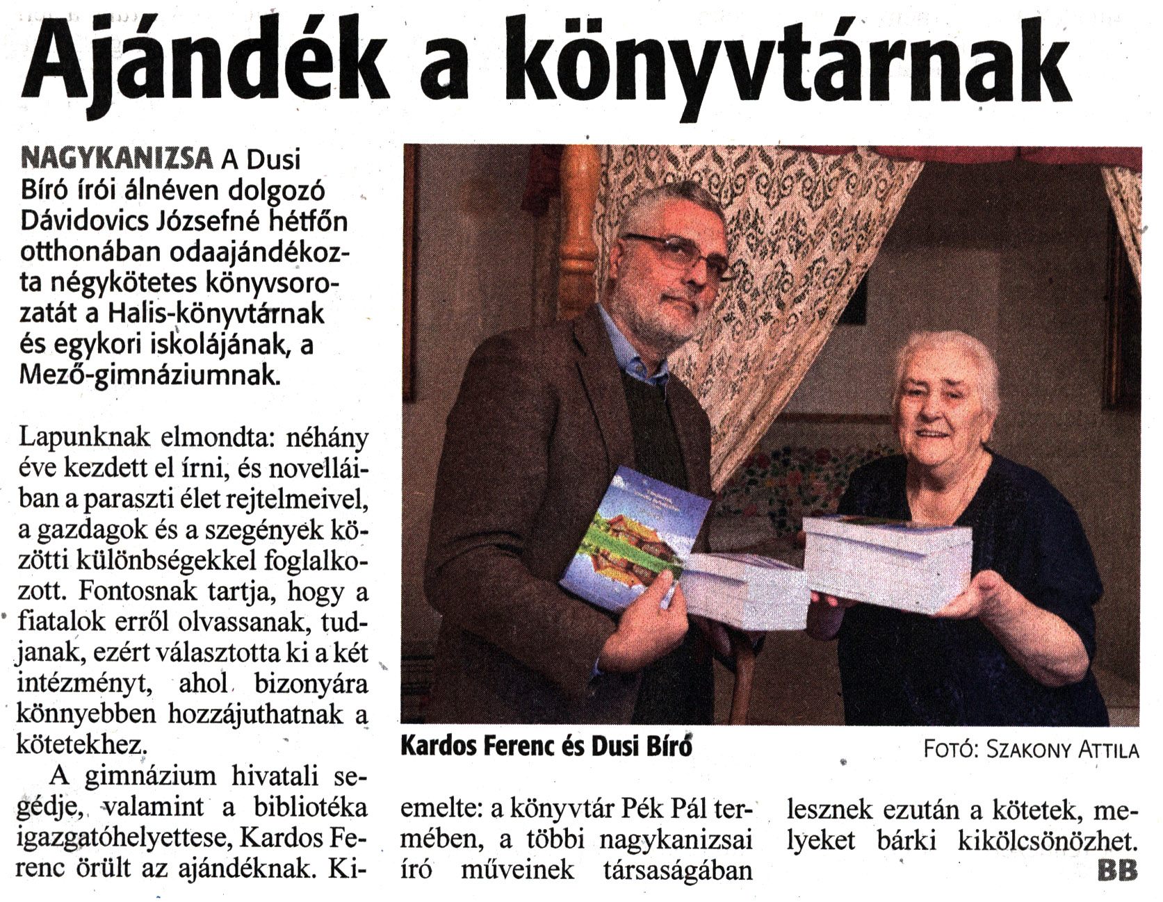 Nyilvános 1011 | 1299 | Zalai Hírlap 2022. november 16. 267. szám 2. oldal | Ajándék a könyvtárnak NAGYKANIZSA A Dusi Bíró írói álnéven dolgozó Dávidovics Józsefné hétfőn otthonában odaajándékozta négykötetes könyvsorozatát a Halis-könyvtárnak és egykori iskolájának, a Mező-gimnáziumnak. Lapunknak elmondta: néhány éve kezdett el írni, és novelláiban a paraszti élet rejtelmeivel, a gazdagok és a szegények közötti különbségekkel foglalkozott. Fontosnak tartja, hogy a fiatalok erről olvassanak, tudjanak, ezért választotta ki a két intézményt, ahol bizonyára könnyebben hozzájuthatnak a kötetekhez. A gimnázium hivatali segédje, valamint a bibliotéka igazgatóhelyettese, Kardos Ferenc örült az ajándéknak. Kiemelte: a könyvtár Pék Pál termében, a többi nagykanizsai író műveinek társaságában lesznek ezután a kötetek, melyeket bárki kikölcsönözhet. BB Kardos Ferenc és Dusi Bírd Fotó: Szakony Attila |