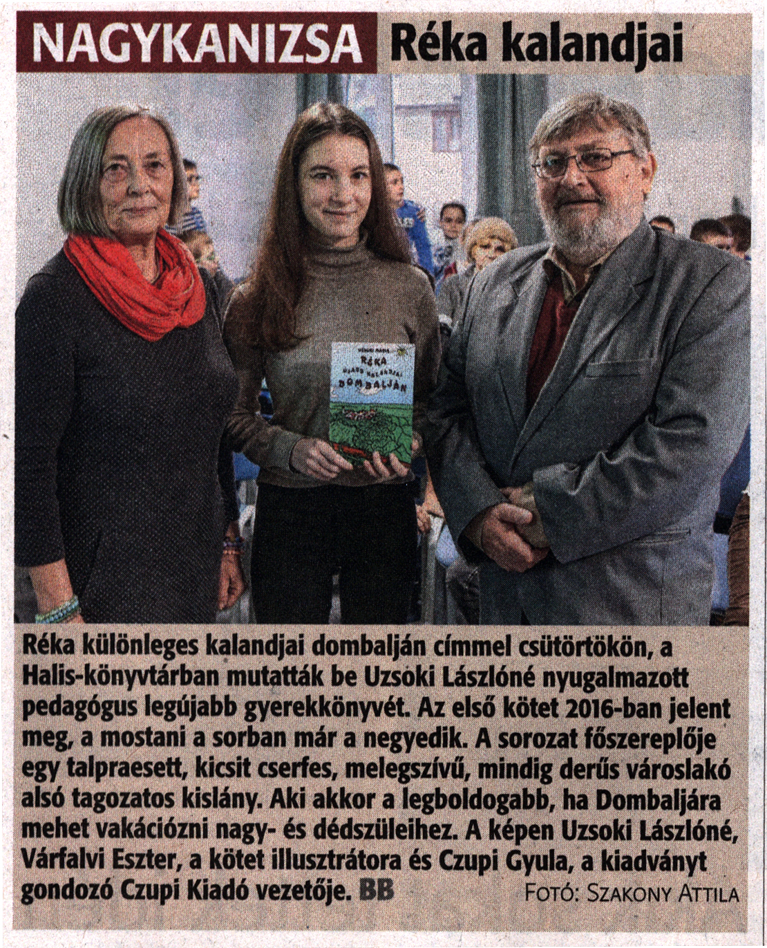 Nyilvános 1076 | 3347 | Zalai Hírlap 2022. december 9. 287. szám 3. oldal | Réka kalandjai NAGYKANIZSA Réka különleges kalandjai dombalján címmel csütörtökön, a Halis-könyvtárban mutatták be Uzsoki Lászlóné nyugalmazott pedagógus legújabb gyerekkönyvét Az első kötet 2016-ban jelent meg, a mostani a sorban már a negyedik. A sorozat főszereplője egy talpraesett, kicsit cserfes, melegszívű, mindig derűs városlakó alsó tagozatos kislány. Aki akkor a legboldogabb, ha Dombaljára mehet vakációzni nagy- és dédszüleihez. A képen Uzsoki Lászlóné, Várfalvi Eszter, a kötet illusztrátora és Czupi Gyula, a kiadványt gondozó Czupi Kiadó vezetője. BB Fotó: Szakony Attila |
