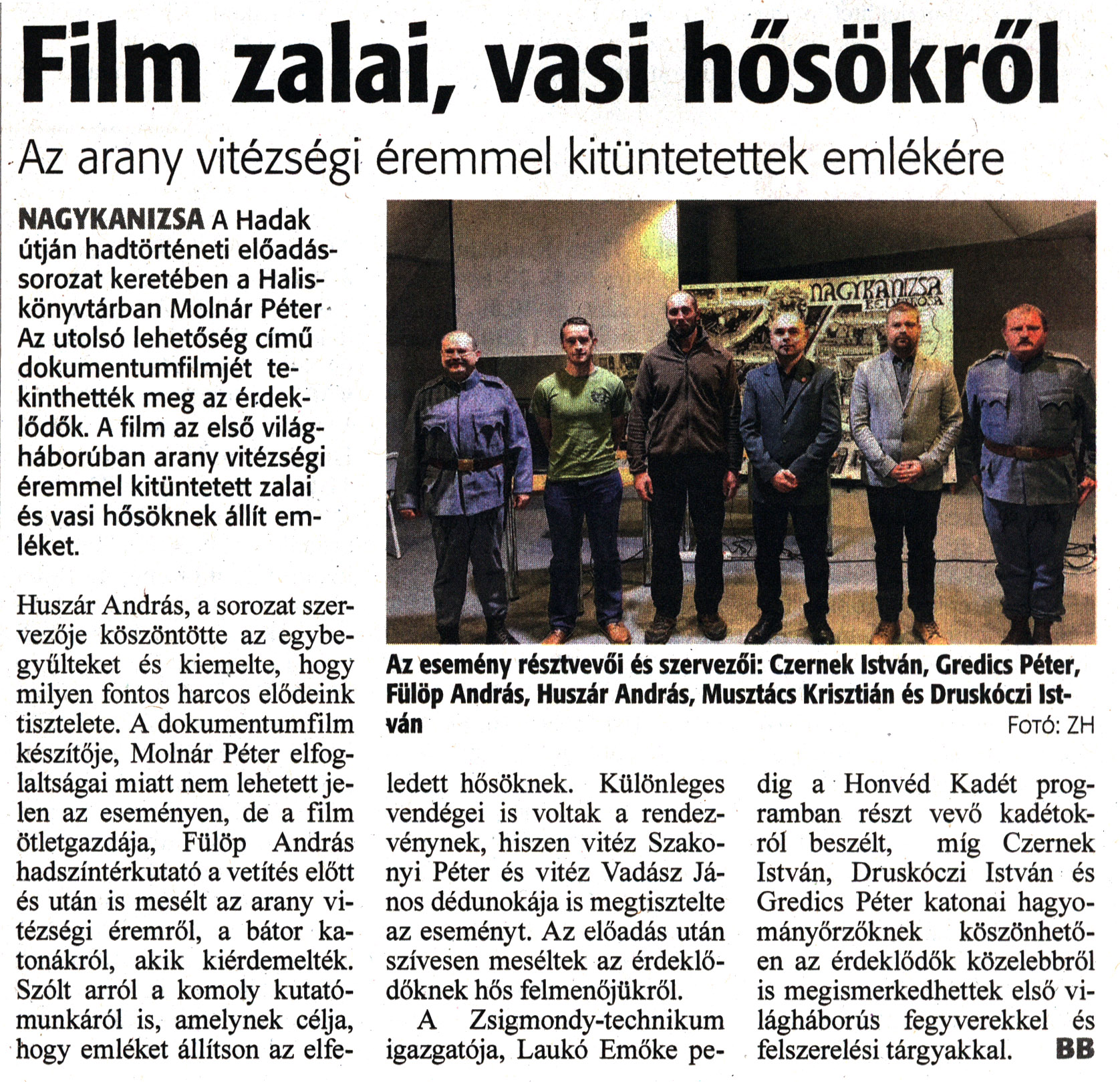 Nyilvános 1008 | 3263 | Zalai Hírlap 2022. december 14. 291. szám 5. oldal | Film zalai, vasi hősökről Az arany vitézségi éremmel kitüntetettek emlékére NAGYKANIZSA A Hadak útján hadtörténeti előadássorozat keretében a Halis-könyvtárban Molnár Péter Az utolsó lehetőség című dokumentumfilmjét tekinthették meg az érdeklődők. A film az első világháborúban arany vitézségi éremmel kitüntetett zalai és vasi hősöknek állít emléket. Huszár András, a sorozat szervezője köszöntötte az egybegyűlteket és kiemelte, hogy milyen fontos harcos elődeink tisztelete. A dokumentumfilm készítője, Molnár Péter elfoglaltságai miatt nem lehetett jelen az eseményen, de a film ötletgazdája, Fülöp András hadszíntérkutató a vetítés előtt és után is mesélt az arany vitézségi éremről, a bátor katonákról, akik kiérdemelték. Szólt arról a komoly kutatómunkáról is, amelynek célja, hogy emléket állítson az elfe- ledett hősöknek. Különleges vendégei is voltak a rendezvénynek, hiszen vitéz Szakonyi Péter és vitéz Vadász János dédunokája is megtisztelte az eseményt. Az előadás után szívesen meséltek az érdeklődőknek hős felmenőjükről. A Zsigmondy-technikum igazgatója, Laukó Emőke pedig a Honvéd Kadét programban részt vevő kadétokról beszélt, míg Czernek István, Druskóczi István és Gredics Péter katonai hagyományőrzőknek köszönhetően az érdeklődők közelebbről is megismerkedhettek első világháborús fegyverekkel és felszerelési tárgyakkal. BB Az esemény résztvevői és szervezői: Czernek István, Gredics Péter, Fülöp András, Huszár András, Musztács Krisztián és Druskóczi István Fotó: ZH |