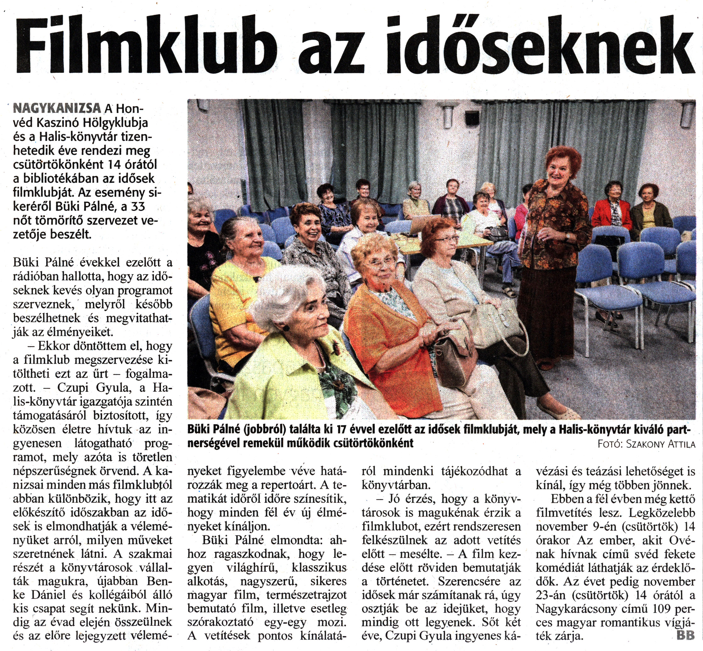 Nyilvános 977 | 1234 | Zalai Hírlap 2023. november 2. 255. szám 6. oldal | Filmklub az időseknek NAGYKANIZSA A Honvéd Kaszinó Hölgyklubja és a Halis-könyvtár tizenhetedik éve rendezi meg csütörtökönként 14 órától a bibliotékában az idősek filmklubját. Az esemény sikeréről Büki Pálné, a 33 nőt tömörítő szervezet vezetője beszélt. Büki Pálné (jobbról) találta ki 17 évvel ezelőtt az idősek filmklubját, mely a Halis-könyvtár kiváló partnerségével remekül működik csütörtökönként Fotó: Szakony Attila Büki Pálné évekkel ezelőtt a rádióban hallotta, hogy az időseknek kevés olyan programot szerveznek, melyről később beszélhetnek és megvitathatják az élményeikét. - Ekkor döntöttem el, hogy a filmklub megszervezése kitöltheti ezt az űrt - fogalmazott. - Czupi Gyula, a Halis-könyvtár igazgatója szintén támogatásáról biztosított, így közösen életre hívtuk az ingyenesen látogatható programot, mely azóta is töretlen népszerűségnek örvend. A kanizsai minden más filmklubtól abban különbözik, hogy itt az előkészítő időszakban az idősek is elmondhatják a véleményüket arról, milyen műveket szeretnének látni. A szakmai részét a könyvtárosok vállalták magukra, újabban Benke Dániel és kollégáiból álló kis csapat segít nekünk. Mindig az évad elején összeülnek és az előre lejegyzett véleményeket figyelembe véve határozzák meg a repertoárt. A tematikát időről időre színesítik, hogy minden fél év új élményeket kínáljon. Büki Pálné elmondta: ahhoz ragaszkodnak, hogy legyen világhírű, klasszikus alkotás, nagyszerű, sikeres magyar film, természetrajzot bemutató film, illetve esetleg szórakoztató egy-egy mozi. A vetítések pontos kínálatáról mindenki tájékozódhat a könyvtárban. - Jó érzés, hogy a könyvtárosok is magukénak érzik a filmklubot, ezért rendszeresen felkészülnek az adott vetítés előtt - mesélte. - A film kezdése előtt röviden bemutatják a történetet. Szerencsére az idősek már számítanak rá, úgy osztják be az idejüket, hogy mindig ott legyenek. Sőt két éve, Czupi Gyula ingyenes kávézási és teázási lehetőséget is kínál, így még többen jönnek. Ebben a fél évben még kettő filmvetítés lesz. Legközelebb november 9-én (csütörtök) 14 órakor Az ember, akit Ové-nak hívnak című svéd fekete komédiát láthatják az érdeklődők. Az évet pedig november 23-án (csütörtök) 14 órától a Nagykarácsony című 109 perces magyar romantikus vígjáték zárja. BB |