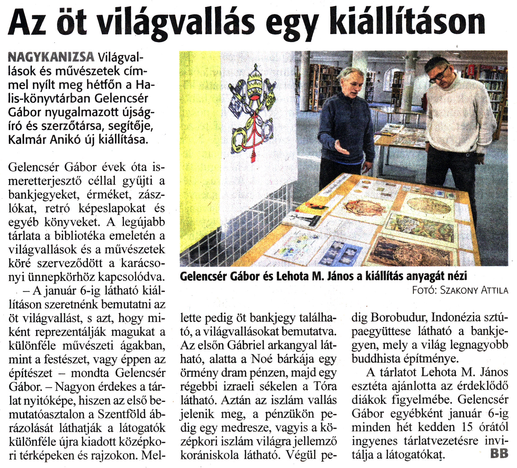 Nyilvános 967 | 1245 | Zalai Hírlap 2023. december 5. 283. szám 3. oldal | Az öt világvallás egy kiállításon Gelencsér Gábor és Lehota M. János a kiállítás anyagát nézi Fotó: Szakony Attila NAGYKANIZSA Világvallások és művészetek címmel nyílt meg hétfőn a Ha-lis-könyvtárban Gelencsér Gábor nyugalmazott újságíró és szerzőtársa, segítője, Kalmár Anikó új kiállítása. Gelencsér Gábor évek óta ismeretterjesztő céllal gyűjti a bankjegyeket, érméket, zászlókat, retró képeslapokat és egyéb könyveket. A legújabb tárlata a bibliotéka emeletén a világvallások és a művészetek köré szerveződött a karácsonyi ünnepkörhöz kapcsolódva. -A január 6-ig látható kiállításon szeretnénk bemutatni az öt világvallást, s azt, hogy miként reprezentálják magukat a különféle művészeti ágakban, mint a festészet, vagy éppen az építészet - mondta Gelencsér Gábor. - Nagyon érdekes a tárlat nyitóképe, hiszen az első bemutatóasztalon a Szentföld ábrázolását láthatják a látogatók különféle újra kiadott középkori térképeken és rajzokon. Mellette pedig öt bankjegy található, a világvallásokat bemutatva. Az elsőn Gábriel arkangyal látható, alatta a Noé bárkája egy örmény dram pénzen, majd egy régebbi izraeli sékelen a Tóra látható. Aztán az iszlám vallás jelenik meg, a pénzükön pedig egy medresze, vagyis a középkori iszlám világra jellemző korániskola látható. Végül pe- dig Borobudur, Indonézia sztúpaegyüttese látható a bankjegyen, mely a világ legnagyobb buddhista építménye. A tárlatot Lehota M. János esztéta ajánlotta az érdeklődő diákok figyelmébe. Gelencsér Gábor egyébként január 6-ig minden hét kedden 15 órától ingyenes tárlatvezetésre invitálja a látogatókat. BB |