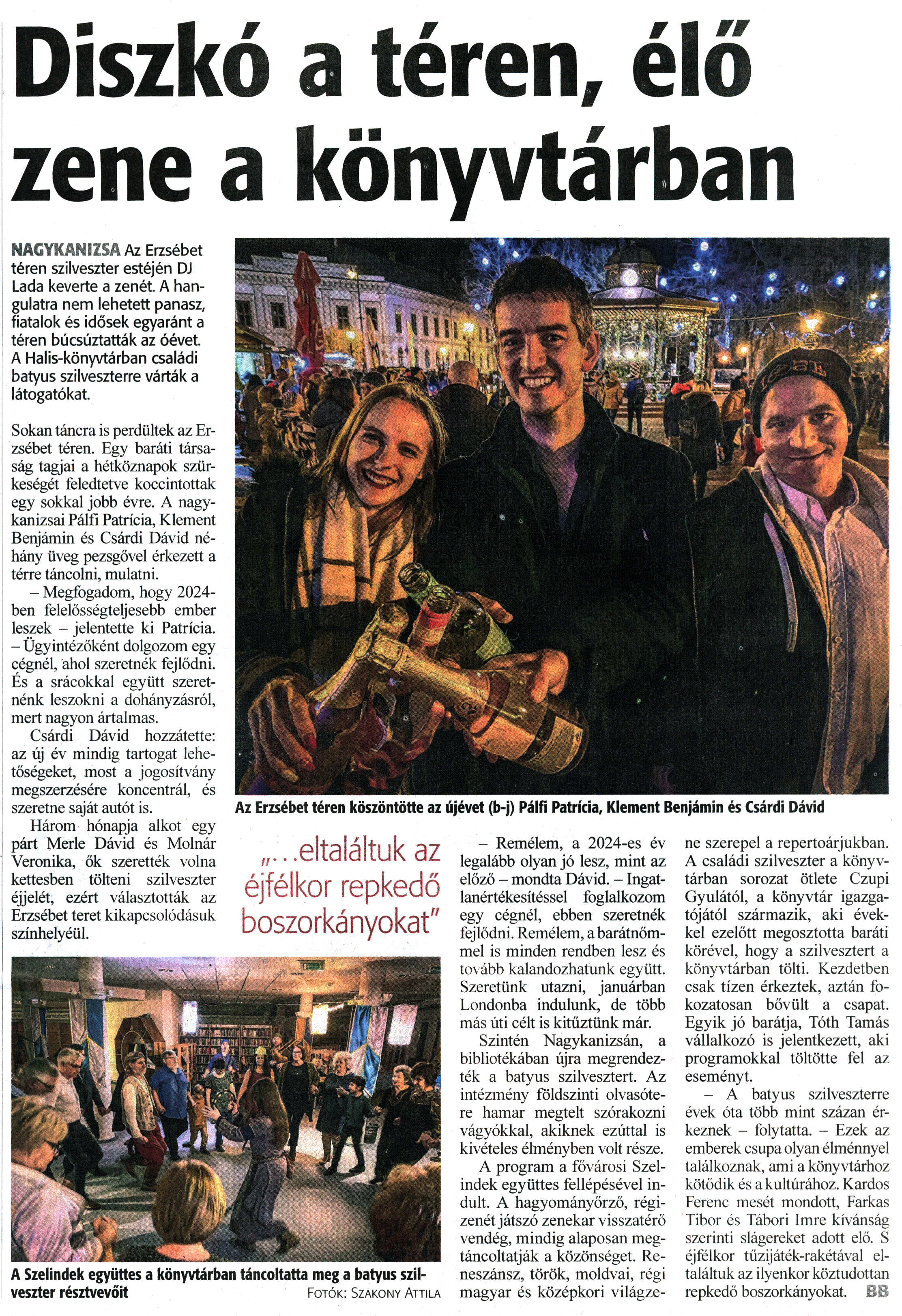 Nyilvános 965 | 1397 | Zalai Hírlap 2024. január 2. 1. szám 3. oldal | Diszkó a téren, élő zene a könyvtárban Az Erzsébet téren köszöntötte az újévet (b-j) Pálfi Patrícia, Klement Benjámin és Csárdi Dávid NAGYKANIZSA Az Erzsébet téren szilveszter estéjén DJ Lada keverte a zenét. A hangulatra nem lehetett panasz, fiatalok és idősek egyaránt a téren búcsúztatták az óévet. A Halis-könyvtárban családi batyus szilveszterre várták a látogatókat. Sokan táncra is perdültek az Erzsébet téren. Egy baráti társaság tagjai a hétköznapok szürkeségét feledtetve koccintottak egy sokkal jobb évre. A nagykanizsai Pálfi Patrícia, Klement Benjámin és Csárdi Dávid néhány üveg pezsgővel érkezett a térre táncolni, mulatni. - Megfogadom, hogy 2024-ben felelősségteljesebb ember leszek - jelentette ki Patrícia. - Ügyintézőként dolgozom egy cégnél, ahol szeretnék fejlődni. És a srácokkal együtt szeretnénk leszokni a dohányzásról, mert nagyon ártalmas. Csárdi Dávid hozzátette: az új év mindig tartogat lehetőségeket, most a jogosítvány megszerzésére koncentrál, és szeretne saját autót is. Három hónapja alkot egy párt Merle Dávid és Molnár Veronika, ők szerették volna kettesben tölteni szilveszter éjjelét, ezért választották az Erzsébet teret kikapcsolódásuk színhelyéül. - Remélem, a 2024-es év legalább olyan jó lesz, mint az előző - mondta Dávid. - Ingatlanértékesítéssel foglalkozom egy cégnél, ebben szeretnék fejlődni. Remélem, a barátnőmmel is minden rendben lesz és tovább kalandozhatunk együtt. Szeretünk utazni, januárban Londonba indulunk, de több más úti célt is kitűztünk már. Szintén Nagykanizsán, a bibliotékában újra megrendezték a bátyus szilvesztert. Az intézmény földszinti olvasótere hamar megtelt szórakozni vágyókkal, akiknek ezúttal is kivételes élményben volt része. A program a fővárosi Szelindek együttes fellépésével indult. A hagyományőrző, régizenétjátszó zenekar visszatérő vendég, mindig alaposan megtáncoltatják a közönséget. Reneszánsz, török, moldvai, régi magyar és középkori világzene szerepel a repertoárjukban. A családi szilveszter a könyvtárban sorozat ötlete Czupi Gyulától, a könyvtár igazgatójától származik, aki évekkel ezelőtt megosztotta baráti körével, hogy a szilvesztert a könyvtárban tölti. Kezdetben csak tízen érkeztek, aztán fokozatosan bővült a csapat. Egyik jó barátja, Tóth Tamás vállalkozó is jelentkezett, aki programokkal töltötte fel az eseményt. - A batyus szilveszterre évek óta több mint százan érkeznek - folytatta. - Ezek az emberek csupa olyan élménnyel találkoznak, ami a könyvtárhoz kötődik és a kultúrához. Kardos Ferenc mesét mondott, Farkas Tibor és Tábori Imre kívánság szerinti slágereket adott elő. S éjfélkor tűzijáték-rakétával eltaláltuk az ilyenkor köztudottan repkedő boszorkányokat. BB A Szelindek együttes a könyvtárban táncoltatta meg a bátyus szilveszter résztvevőit Fotók: Szakony Attila |