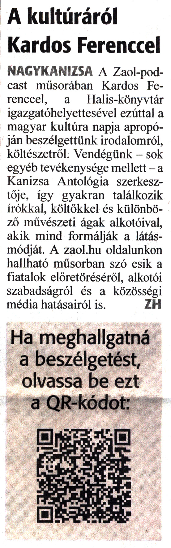 Nyilvános 946 | 1223 | Zalai Hírlap 2024. január 23. 19. szám 1. oldal | A kultúráról Kardos Ferenccel NAGYKANIZSA A Zaol-pod-cast műsorában Kardos Ferenccel, a Halis-könyvtár igazgatóhelyettesével ezúttal a magyar kultúra napja apropóján beszélgettünk irodalomról, költészetről. Vendégünk - sok egyéb tevékenysége mellett - a Kanizsa Antológia szerkesztője, így gyakran találkozik írókkal, költőkkel és különböző művészeti ágak alkotóival, akik mind formálják a látásmódját. A zaol.hu oldalunkon hallható műsorban szó esik a fiatalok előretöréséről, alkotói szabadságról és a közösségi média hatásairól is. ZH Ha meghallgatná a beszélgetést, olvassa be ezt a QR-kódot |