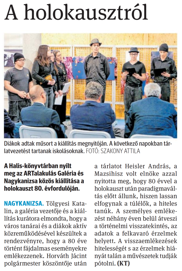 Nyilvános 818 | 1324 | Zalai Hírlap 2025. április 2. 77. szám 1. oldal | A holokausztról A Halis-könyvtárban nyílt meg az ARTalakulás Galéria és Nagykanizsa közös kiállítása a holokauszt 80. évfordulóján. NAGYKANIZSA. Tölgyesi Katalin, a galéria vezetője és a kiállítás kurátora elmondta, hogy a város tanárai és a diákok aktív közreműködésével készültek a rendezvényre, hogy a 80 éve történt fájdalmas eseményekre emlékezzenek. Horváth Jácint polgármester köszöntője után a tárlatot Heisler András, a Mazsihisz volt elnöke azzal nyitotta meg, hogy 80 évvel a holokauszt után paradigmaváltás előtt állunk, hiszen lassan elfogynak a túlélők, a hiteles tanúk. A személyes emlékezést néhány éven belül átveszi a történelmi visszatekintés, az adatok a felkavaró érzelmek helyett. A visszaemlékezések hitelességét s az érzelmek hiányát talán a művészetek tudják pótolni. (KT) Diákok adtak műsort a kiállítás megnyitóján. A következő napokban tárlatvezetést tartanak iskolásoknak. FOTÓ: SZAKONY ATTILA |