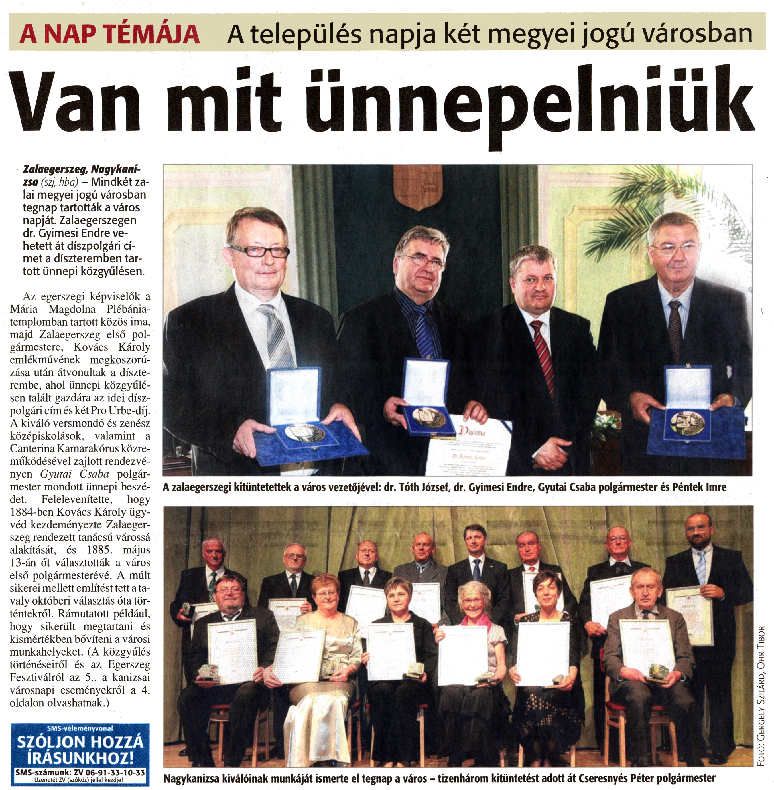 Nyilvános 1554 | 3823 | Zalai Hírlap 2011. május 14. 112. szám 1. oldal - Van mit ünnepelniük | A cikk szövege: A NAP TÉMÁJA A település napja két megyei jogú városban Van mit ünnepelniük Zalaegerszeg, Nagykanizsa (szj, hba) - Mindkét zalai megyei jogú városban tegnap tartották a város napját. Zalaegerszegen dr. Gyimesi Endre vehetett át díszpolgári címet a díszteremben tartott ünnepi közgyűlésen. Az egerszegi képviselők a Mária Magdolna Plébániatemplomban tartott közös ima, majd Zalaegerszeg első polgármestere, Kovács Károly emlékművének megkoszorúzása után átvonultak a díszterembe, ahol ünnepi közgyűlésen talált gazdára az idei díszpolgári cím és két Pro Urbe-díj. A kiváló versmondó és zenész középiskolások, valamint a Canterina Kamarakórus közreműködésével zajlott rendezvényen Gyutai Csaba polgármester mondott ünnepi beszédet. Felelevenítette, hogy 1884-ben Kovács Károly ügyvéd kezdeményezte Zalaegerszeg rendezett tanácsú várossá alakítását, és 1885. május 13-án őt választották a város első polgármesterévé. A múlt sikerei mellett említést tett a tavaly októberi választás óta történtekről. Rámutatott például, hogy sikerült megtartani és kismértékben bővíteni a városi munkahelyeket. (A közgyűlés történéseiről és az Egerszeg Fesztiválról az 5., a kanizsai városnapi eseményekről a 4. oldalon olvashatnak.) A zalaegerszegi kitüntetettek a város vezetőjével: dr. Tóth József, dr. Gyimesi Endre, Gyutai Csaba polgármester és Péntek Imre Nagykanizsa kiválóinak munkáját ismerte el tegnap a város - tizenhárom kitüntetést adott át Cseresnyés Péter polgármester |