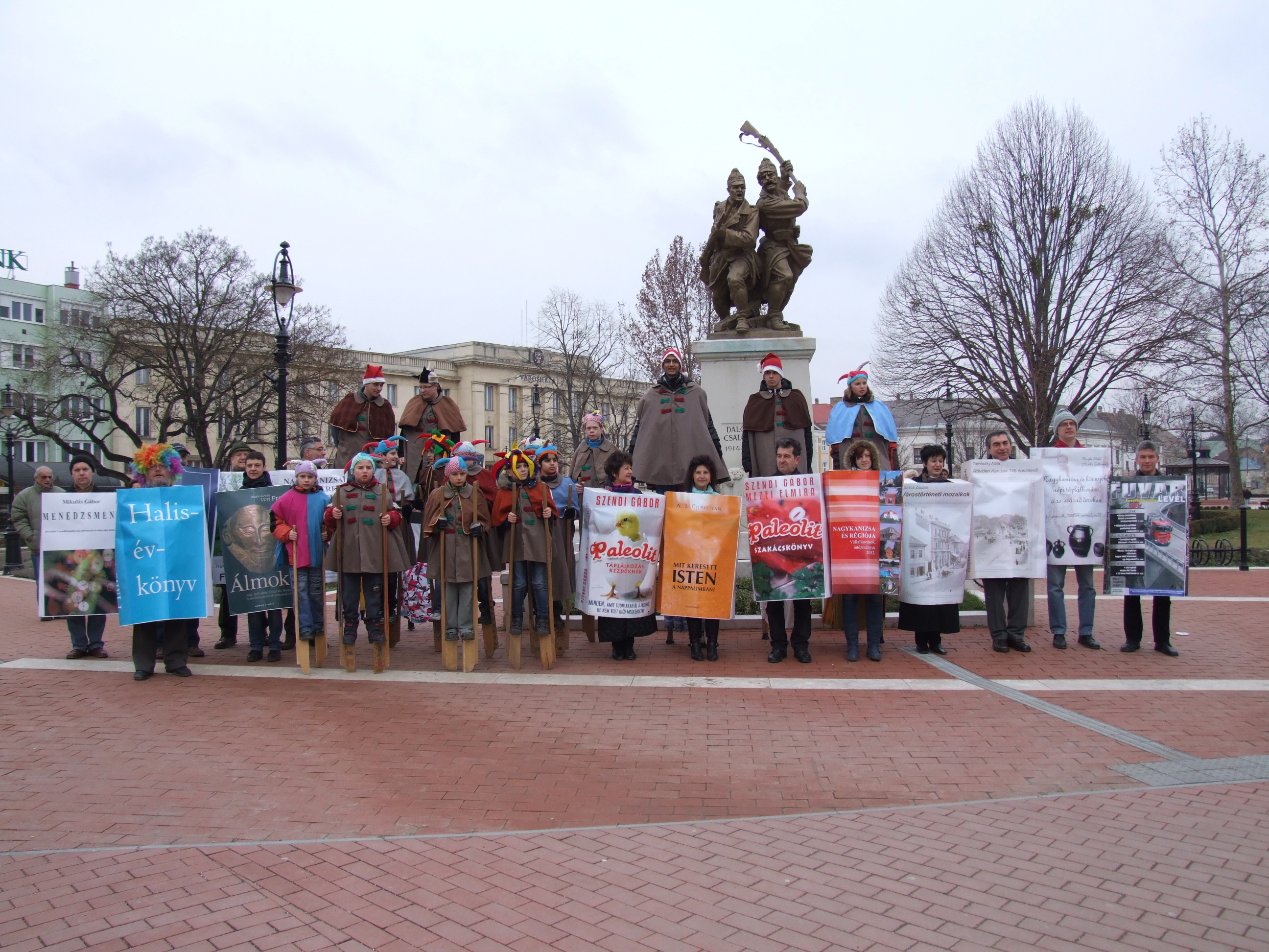 Nyilvános 958 | 1400 | 2013. február 9. A farsangi fánkfesztiválra készülve felhívásban kértük olvasóinkat, hogy öltsék magukra kedves könyvüket. Egy „könyvespolcnyi” jelentkező vette magára kedves olvasmányát, az ő vonulásukról készültek ezek a képek. A környezetükben néhol láthatók a Nagykanizsai Gólyalábasok, akik szintén a könyvtárhoz kötődnek. A „felvonuló kötetek” a könyvtár épületében még megtekinthetők. | |