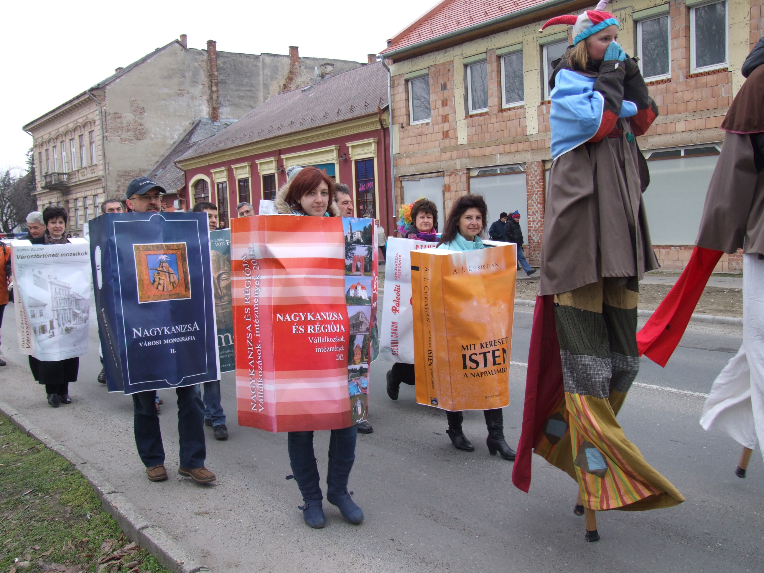 Nyilvános 963 | 1328 | 2013. február 9. A farsangi fánkfesztiválra készülve felhívásban kértük olvasóinkat, hogy öltsék magukra kedves könyvüket. Egy „könyvespolcnyi” jelentkező vette magára kedves olvasmányát, az ő vonulásukról készültek ezek a képek. A környezetükben néhol láthatók a Nagykanizsai Gólyalábasok, akik szintén a könyvtárhoz kötődnek. A „felvonuló kötetek” a könyvtár épületében még megtekinthetők. | |
