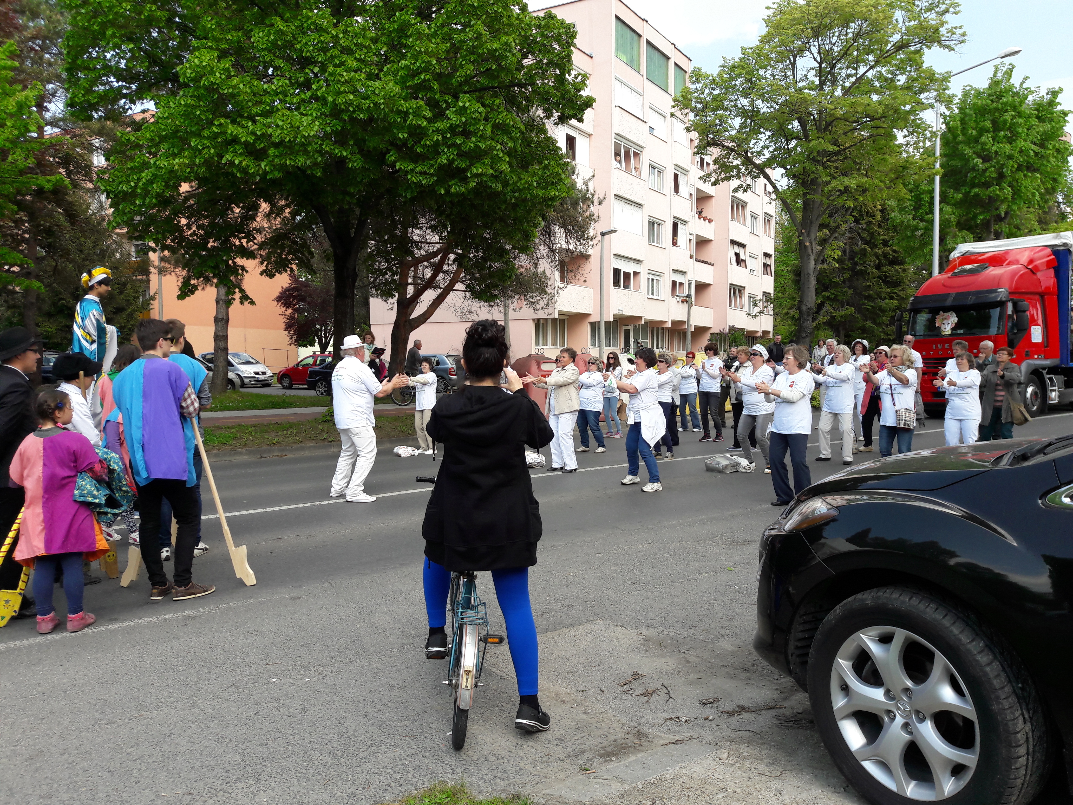 2017.04.30. Utca Tánc Fesztivál - Vonulás - Gólyalábasok, fekete kalapos táncosok, meridián tornások