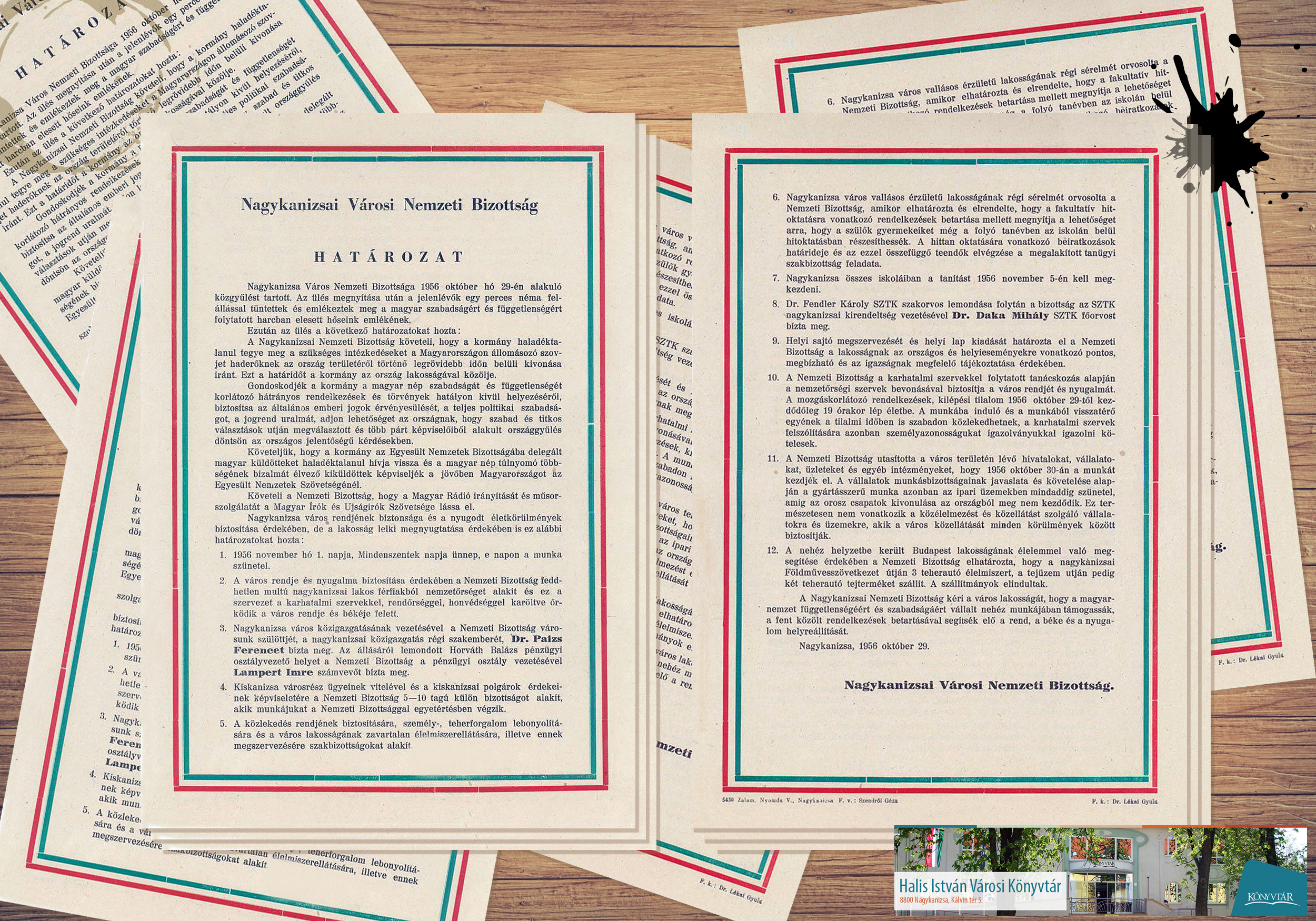 Nyilvános 1212 | 2008 | Rövid leírás | Teljes leírás (582 B) | Nagykanizsai dokumentumok 1956 közelgő évfordulójára Több dokumentum bemutatásával emlékezünk 1956 nagykanizsai eseményeire. Az időszakban kevés nyomdatermék készülhetett. Több azonban fennmaradt. Az Országos Széchényi Könyvtár (OSZK) gyűjteményének felhasználásával a következő hetekben egy-egy emlék megmutatásával emlékezik könyvtárunk. A forradalmi napok új városi vezetése, a Nemzeti Bizottság első határozatait, döntéseit így hozta a város közönségének tudomására 1956. október 29-én szórólapként. |